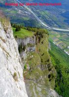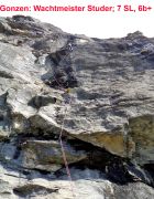 7. SL (10 m 6a): Ein kleines Dachl, aber mit guten Griffen. Bischen hau-ruck nötig, um an der Kante aufzustehen und höherzugreifen! Oben im Waagrechten ist ein Felsblock mit Kette, 2 m von Kante entfernt.