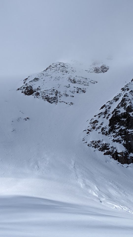 Danach gute Sicht. Schnee in der Wand war so bisschen alles. Relativ weich, schwer, variabel mit Cookies drin. Mit 106mm ganz cool zum Fahren, aber eine Highspeed Abfahrt lag schon nicht drin.