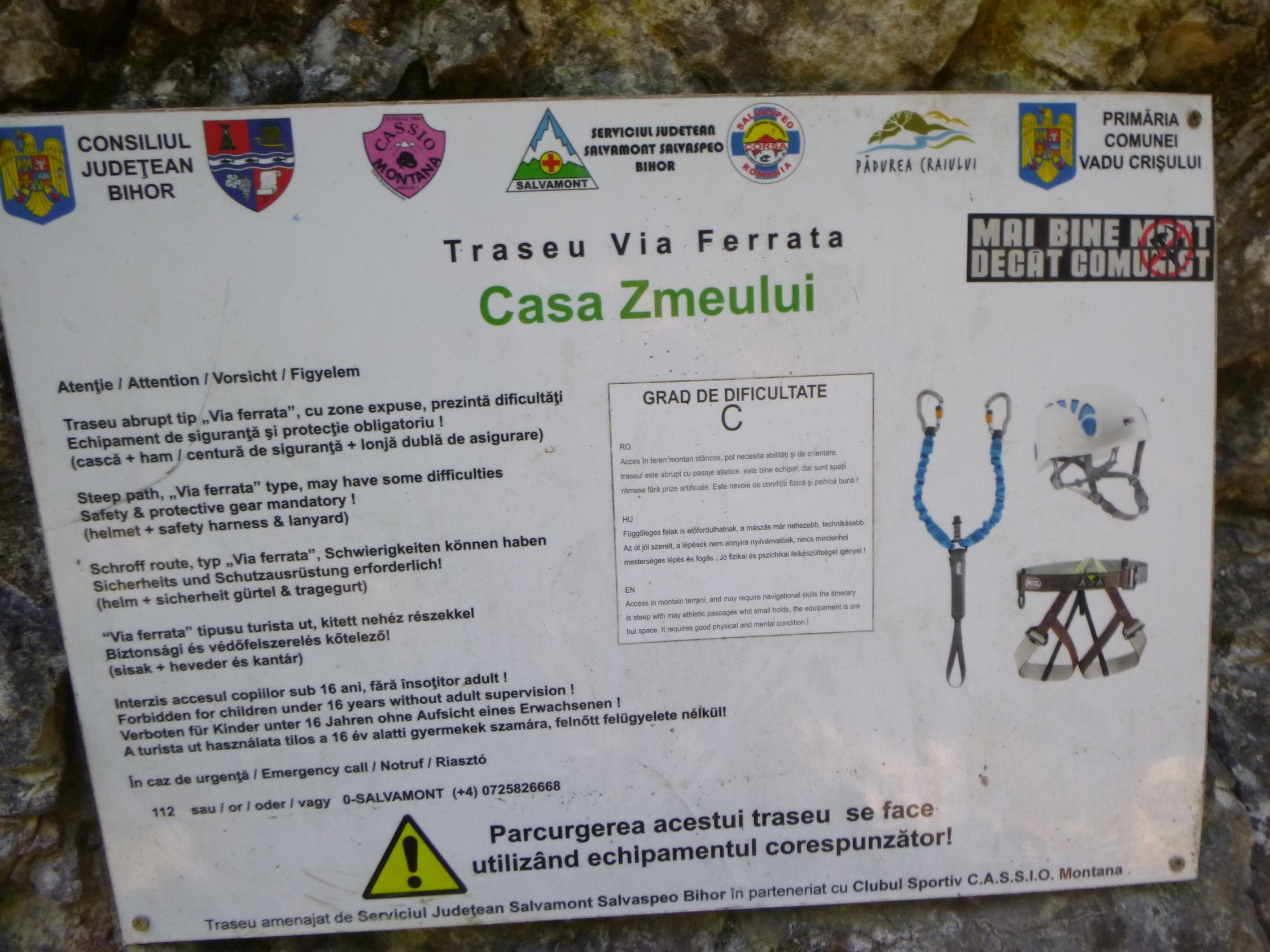 Man folgt dem breiten Wanderweg südwärts in die beginnende Crișul-Repede-Schlucht und kommt kurz danach an einer Wasserquelle in kleiner Felshöhle an linker Wegseite vorbei, wo man sich erfrischen kann. Danach engt der Weg ein zum Graspfad links vom Bahngleis. Rechts davon zweigt der breite Weg ab zu einer befahrbaren Brücke über das breite Flußbett des Crișul Repede. Danach wechselt der Wanderweg zur rechten Seite des Gleises ohne Markierungszeichen. Über den Schotter des Bahndammes läuft man direkt neben dem Gleis links vom Fluß. Vorbei an einer Station mit Seilrutsche über den Fluß stößt man nach 25 min. auf ein braunes Schild „Turnul Vama Sarii sec.XIII“ mit Linkspfeil. Entlang der linken Schluchtseite stehen die „Großen Mauern“ (Paretii Mari) des Crisul-Flusses. Nach 2 min. steht auf linker Seite des Gleisbettes ein weißes Schild „Peștera Casa Zmeului Tündérvár“. Dahinter befindet sich die Höhle und daneben beginnt der 215 m lange Klettersteig über 140 Hm (2 min.).