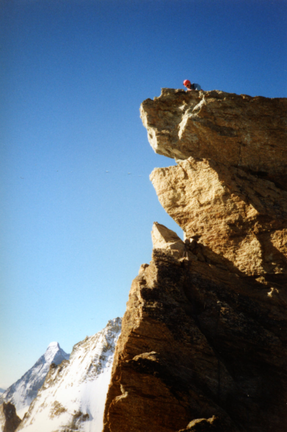 Vom Bivouac au Col de la Dent Blanche folgt man dem Grat der anfänglich keine Schwierigkeiten aufweist, später folgen einige Gendarmen die zu überklettern sind bis auf den Gipfel des Grossen Gendarm- hier meist Schlingen die einem zum Abseilen verleiten. Man kann sich die Abseilerei sparen in dem man auf der O-Seite steil auf ein Band abklettert und diesem zurück zum Grat hinter dem Gendarmen folgt (die Stelle ist einfacher als es von oben den Anschein macht...). Es folgen kurz vor dem Gipfel noch einige kleine Gendarmen die (vor allem bei Vereisung) nicht einfach zu überlisten sind. Muss man zum Ausgangspunkt Ferpècle zurück am besten wieder den SW-Grat hinunter oder via den Col de la Couronne . Der Col de Bricola ist auf der Val d`Hérens Seite fast nicht mehr passierbar!
