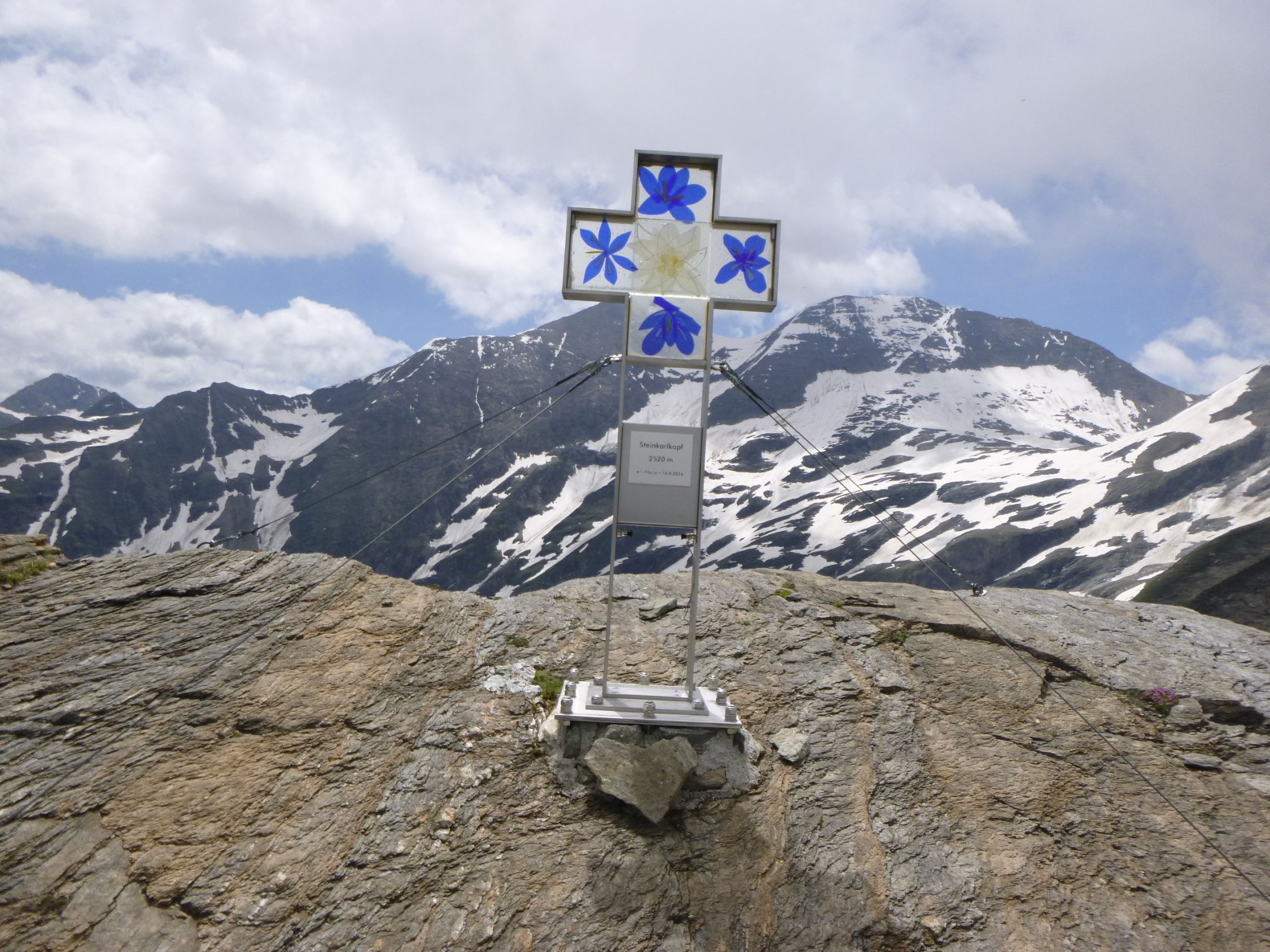 Man folgt dem Wegweiser bei der Schwarzenberghütte rot-weiß signalisiertem Bergweg Nr. 727 südwestwärts hinauf zum Remsschartl. Dabei traversiert man unterhalb der Ostplatten der Hohen Dock das lawinenanfällige Gelände. Bei noch vorhandenen Altschneefeldern und Resten der Lawinenabgänge kann man über diese 15° bis 20° schrägen Passagen mit Steigeisen ohne Höhenverluste und schneller (jedenfalls im Abstieg) überwinden als dem Sommerweg über die Schutt- und Felsplatten-Terrassen zu folgen. Etwa 150 Hm unterhalb vom Remsköpfl (2639 m) verlässt man die Route nach links und quert einen 20° schrägen Schotter- bzw. Altschneehang zu einem steinigen Sattel zwischen Remsköpfl und Steinkarlkopf. Vom Sattel folgt man dann kleinen roten Punkten über den unschwierigen Felsgrat nordostwärts zum Steinkarlkopf (1,5 Std.). Die SO-Seite des Felsberges ist abbruchartig steil hinab zum Steinkarl am obersten Ende des Käfertals. Die NW-Seite dagegen rampenartig über lockere Platten und grasigen Schotter. Alternativ läuft man im Auf- oder/und Abstieg zum sandigen Sattel Remsschartl (2610 m) zwischen der felsscharte (2671 m), wo der Wegweiser sich am Fels befindet und der Hohe Dock-Steig (Bergweg-Nr. 733) beginnt, bzw. der Bergweg Nr. 727 über den Hohen Gang und weiterführt über den Bockkarkees und die Bockkarscharte bis zur Oberwalderhütte. Vom Sandsattel kann man unschwierig weglos und unmarkiert (bis zum steinigen Sattel) über den Felsengrat bis zum Steinkarlkopf kraxeln. Auf dem unscheinbaren Felsengipfel standen mal einfache Holzkreuze, die verwitterten. Ein dreiköpfiges Montage-Team errichtete am 16.9.2016 das neue Gipfelkreuz aus Edelstahl mit Glas-Eelementen, welches über 80 kg schwer ist und in Einzelteilen hinaufgetragen wurde mit Ausnahme der halbmetergroßen Grundplatte, welche mit erstem Hubschrauber-Flug zur Hütte in jenem Jahr mit hinaufnahm. Das 1,6 m hohe Kreuz wurde von der Schlosserei Jäger in Kaprun gefertigt nach der Zeichnung von L. Hasenauer von der Bergwacht Fusch. Zwischen den beiden Streben des Kreuzfußes befindet sich die Kassette für das Gipfelbuch. Deren Einschub kann man durch 2 Federtaster nach unten auslösen. 4 Stahlseile spannen das Kreuz ab zum Schutz gegen Windkräfte durch die Staublawinen von der Hohen Dock und bei Gewichtsvermehrung durch Vereisung. Am Abend scheint die Sonne bildschön durch das Kreuz.