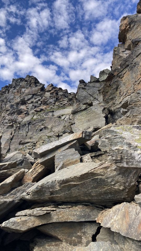 Ab 2600m Schneefelder und Lawinenreste mit Steinschlag vom Frühling. Kann links (südlich) umgangen werden. Zunehmend steiler werdende Flanke bis zum Sattel 2960m.