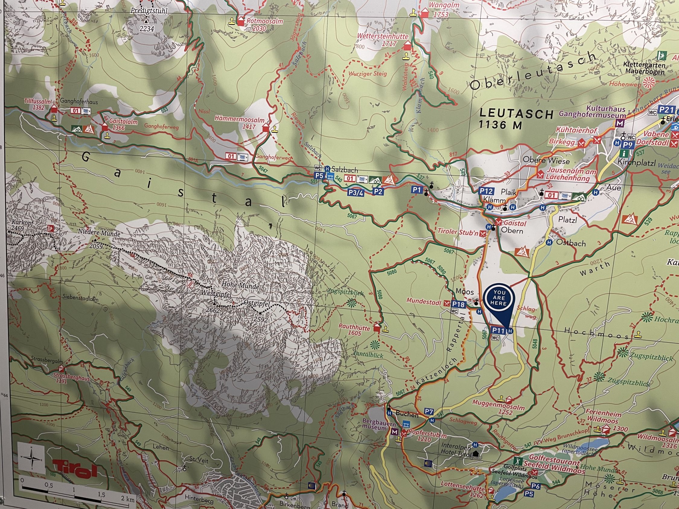 Von der Niederen Munde steigt man den nordseitigen Bergweg mit Nr. 811 hinab. Rot-weiße Markierungen sind nicht zu übersehen bis hinab bis zur Kreuzung mit einem Forstweg (55 min.). Weiter geradeaus hinab zur Brücke über die Leutascher Ache unterhalb der Tilfußalm. Anfangs entlang der 4 km langen Schotterpiste ostwärts bis zur Brücke P 1302, vor letztem Parkplatz P5. Dort dann über die Brücke nach rechts hinüber auf den breiten Wanderweg (Wegweiser), welcher rechtsseitig (in Flußrichtung gesehen) talauswärts führt, der für MTB’ler verboten ist zu benutzen. Nach 1¼ Std. erreicht man die etwas wackelige Hängebrücke beim Parkplatz P1, ca. 100 m vor dem Steg zum Kalvarienberg, wo die Tour begann.