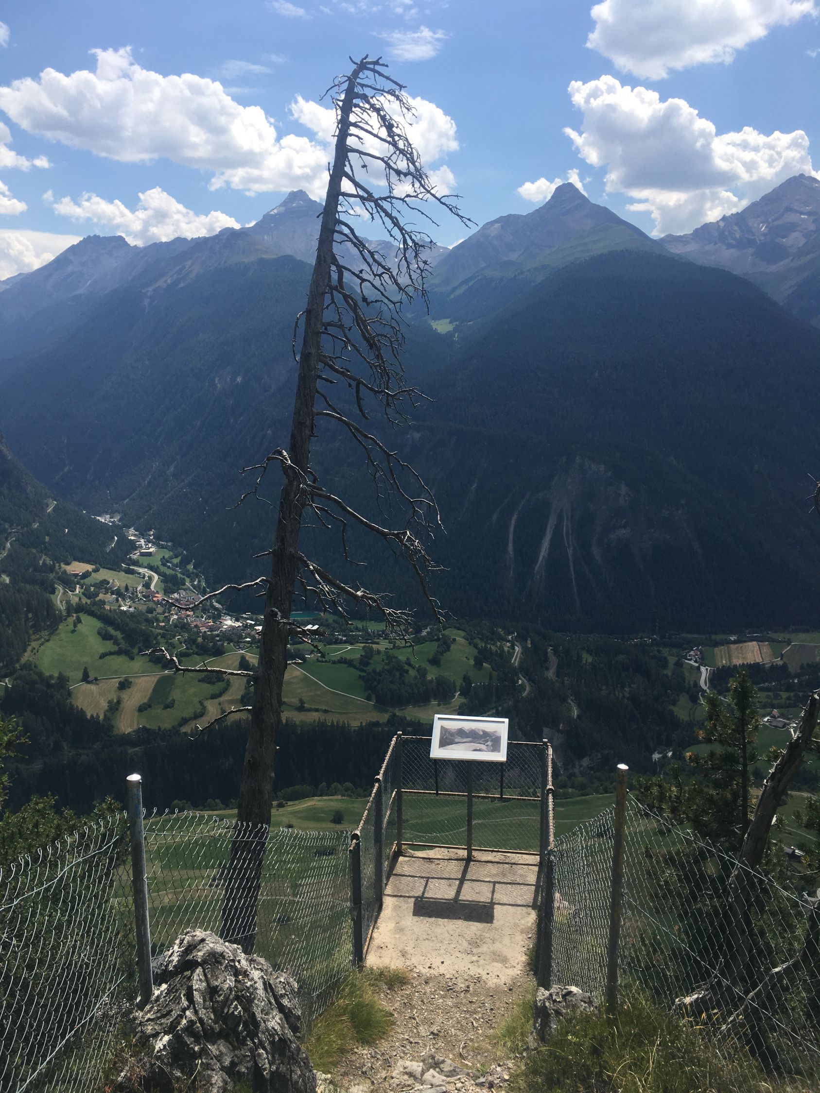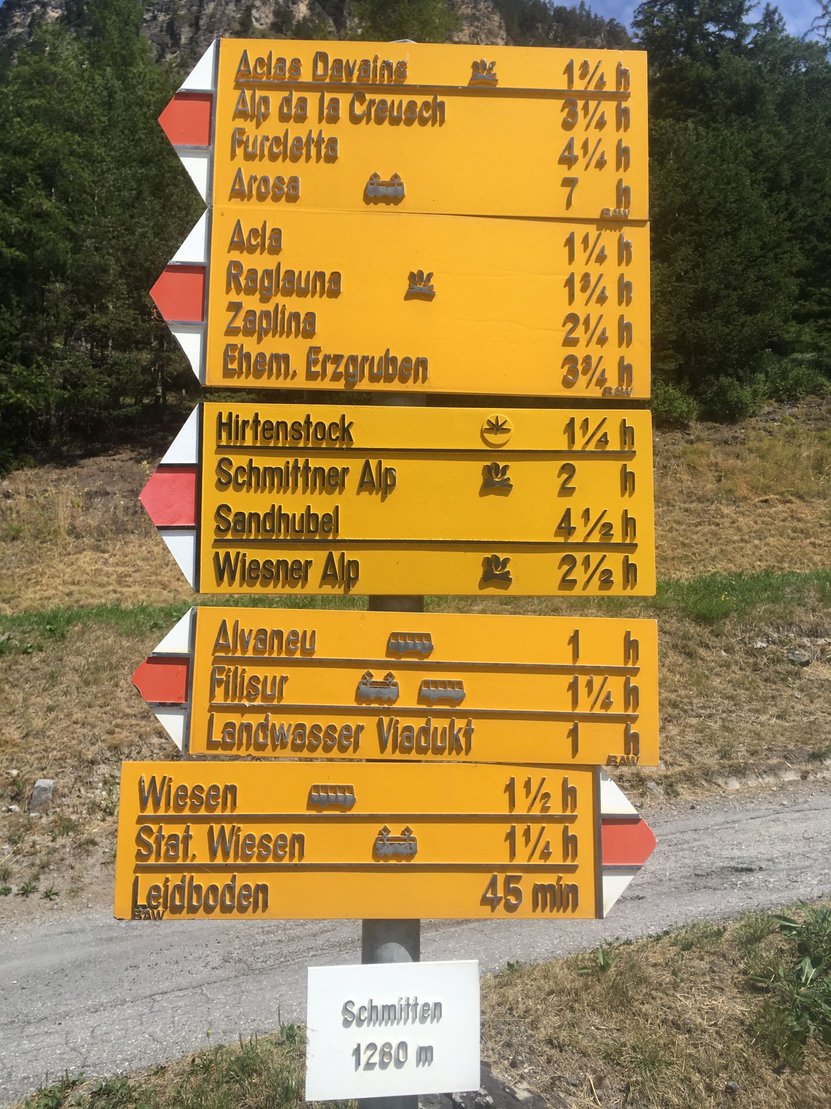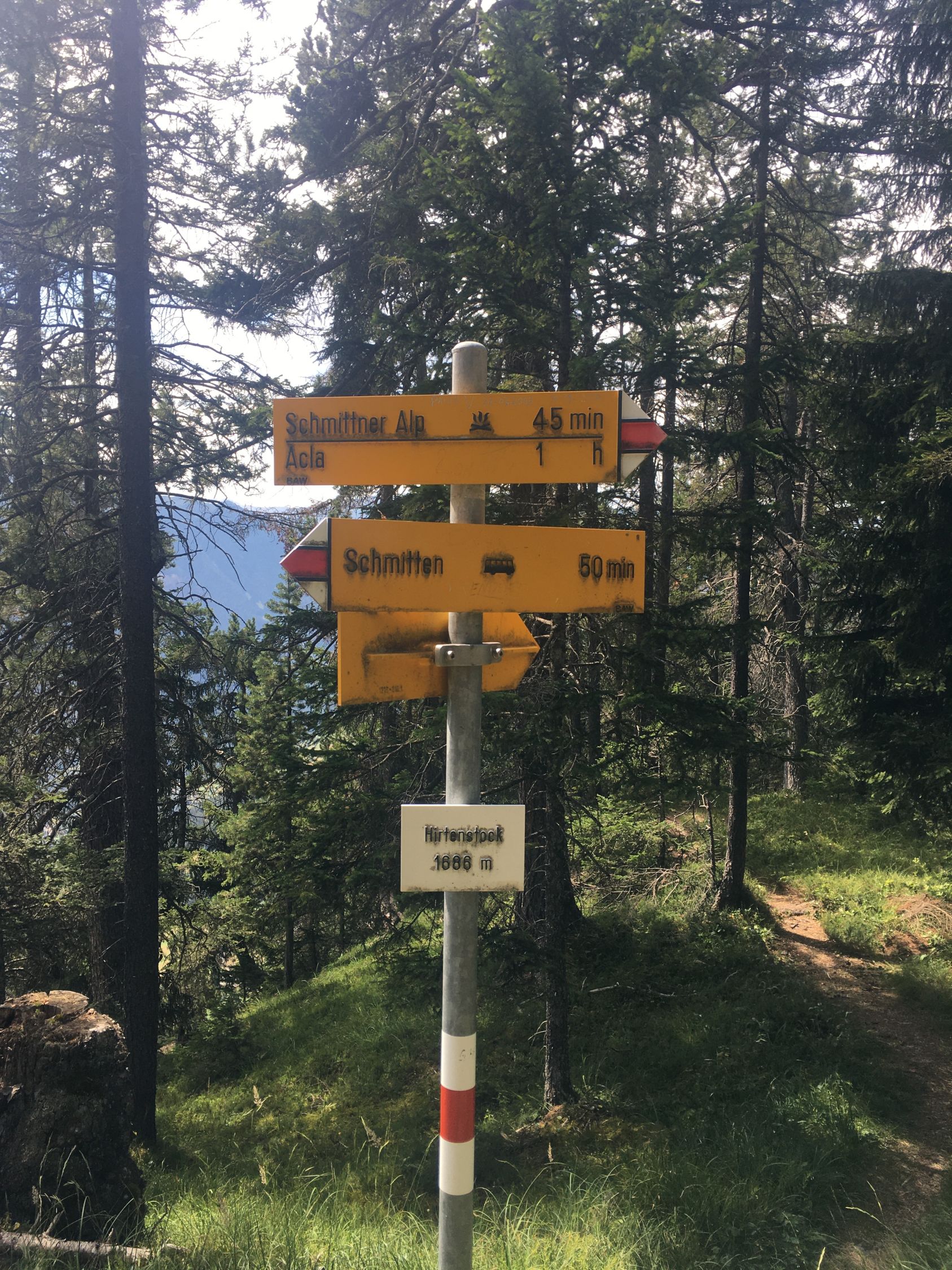 Von Schmitten Innerdorf 1283 m auf Alpsträsschen Richtung Westen. Nach 150 m das Alpsträsschen verlassen und ein nicht markierter Wanderweg (altes Alpsträsschen) Richtung Nordosten bis zur breiten Alpstrasse Richtung Valschgira Punkt 1565. Nun nach Links Richtung Südwesten zum Punkt 1686 und etwas hinunter zur Aussichtsplattform. Abstieg wie Aufstieg.