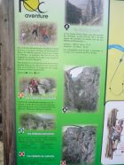 Die Benutzung der KS-Routen ist kostenpflichtig. Es gibt 4 verschiedene Routen, die farblich markiert sind. Gelb die 30 m lange Anfänger-Route V.F. découverte (Schwierigkeit KS 2-, bzw. A/B), grün die 100 m lange V.F. verte (Schwierigkeit: KS 2, bzw. B), rot die 300 m lange V.F. rouge (Schwierigkeit: KS 4-, bzw. C) und schwarz die 1200 m lange V.F. noire (Schwierigkeit: KS 5-, bzw. D). Wer alle Steige läuft, kommt auf ca. 2,8 km Weglänge mit den Abstiegen. Die zweite Ferrata beginnt mit kurzer senkrechter Leiter und führt nicht all zu hoch, parallel über den Bach auf einem Felsband zu einer Hängebrücke über eine Felsbucht und zum Bachufer zurück, wo von rechts der Zustiegsweg ankommt zu den letzten beiden Steig-Varianten (20 min.). Nach kurzem Gehgelände führt ein Seil hinab zum Bachufer. Dort beginnt rechts an östlicher Schluchtwand der schwere Steig, der sich aufgabelt. Nach oben die V.F. rouge durch eine Grotte (50 min.), oder geradeaus weiter parallel über dem Bach die V.F. noire in nördliche Richtung. Dabei unterquert man auf Felsbändern die gewaltige, gekrümmte Freibogen-Rohrleitung Siphon de la Gyronde der EDF. Man nähert sich danach der untersten Hänge-Brücke an. Zu ihr muss man ca. 10 m an senkrechter Wand hinaufklettern. Überdiese Nepalbrücke kommt man zur gegenüberliegenden Felswand. An dieser ca. 30 m hinauf, um auf oberer Hängebrücke wieder zur östlichen Schluchtseite zu gelangen. Dort dann hinauf, wo man sich der rot markierten Steig-Variante nähert. Nach rechts gibt es dann eine Ausstiegsmöglichkeit (échappatoire) zum Ende der V.F. rouge. Dabei trifft man dann auf sandigen Abstiegsweg, wo man rechts einschlägt und in 15 min. zum Kiosk zurückkommt. Die schwarz gekennzeichnete Variante führt nun weiter entlang der östlichen Bachschlucht. Dabei unterquert man die oberste und längste Hängebrücke, über welche der Rückweg verläuft. Vor einer Linkskurve der Schlucht gibt es nach rechts zweite seilgesicherte Notausstiegsmöglichkeit. Andernfalls kommt man weiter zu einer 3-Seil-Brücke, welche an rechter Schluchtseite durch ein Netz geschützt wird vor Steine und Wasser, falls mal Wasser aus der Druckrohrleitung abgelassen werden muss. Danach kommt man seilgesichert über Gehgelände im Zickzack hinab zum Bach. Über flache Hängebrücke erreicht man die 130 m hohe Schlußwand Piller final. Viele Eisenbügel und das 12 mm dicke Stahlseil führen westseitigen Pfeiler senkrecht, um eine Kante herum, dann luftig querend zu einem Felsabsatz. Dieser liegt bereits ab Morgen in der Sonne. Nun senkrecht hinauf. Nach 2 Std. erreicht man dann den flachen Gipfelkopf (1150 m). Rechterhand sieht man die Zwischenstation der beiden Tyroliennes. Vom obersten Startpunkt bei Serre des Fourches (1200 m) führt das 500 m lange Seil in 200 m Höhe dorthin und von dort etwas tiefer eine 200 m lange Seilrutsche über die Schlucht zur Ostseite zurück zur Landestation beim Wasser-Auslass der Druckrohrleitung. Für die Seilrutsche wird spezielle Seilrolle vom Betreiber ROC aventure zur Verfügung gestellt.