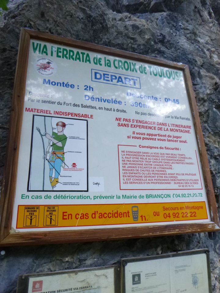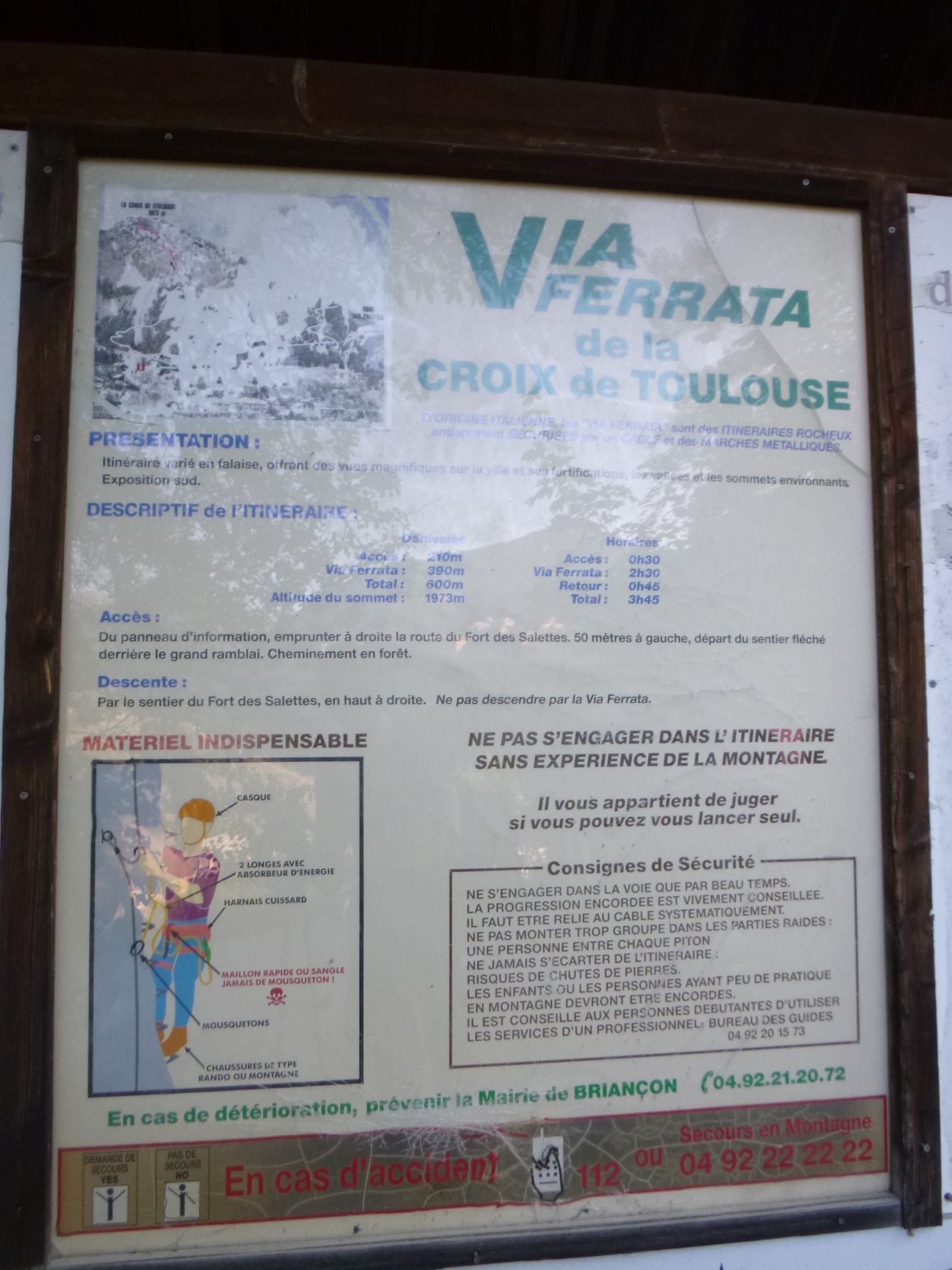 Der Klettersteig Via ferrata de la Croix de Toulouse führt über festen Fels mit vielen Stahlklammern gesichert die ca. 400 m hohe Felswand zum Croix de Toulouse hinauf. Die Fixpunkte des Sicherungsseiles sind als typisch für französische Sportklettersteige „Schweineschwanzform“ ausgebildet, um als zusätzliche Sicherung ein Textilseil dort karabinerlos ein- und aushängen kann. Rechts von der KS-Tafel am Fels beginnt diagonal rechts über anfangs stufiges Gelände, bis es dann vertikal auf Eisenbügeln luftig zu einer flachen senkrechten Einknickung geht, rechts von einer bewachsenen Felsbucht. Der Abschnitt „Le Pas“ führt links um eine Felskante zu einer senkrechten Verschneidung. An deren linken Seite benutzt man die Eisenbügel hinauf und dann weiter nach oben zu einem separaten Pfeiler vor der Wand. Hinauf auf diesem dann quert man nach rechts zur 10 m langen Hängebrücke „Passerelle du Président“ mit Gitterrosten als Trittflächen, welche an die Felswand führt. Diese dann senkrecht ca. 20 m auf Eisenbügeln hoch. Danach läuft der KS-Abschnitt nach rechts in Gehgelände aus (70 min.). Nach 8 min. über einen mit Steinmandl markierten Pfad erreicht wieder ein Wandstück, über welches man auf natürlichen Tritten und anhand zahlreicher Felsgriffe klettert (5 min.). Dann nähert man sich über kurzen Grat der Aussichtskanzel an, die man von links nach rechts unterquert. Am Einige Meter vor dem Geländer der Plattform endet das Seil (5 min.). Vor der Plattform steht eine Windrose mit Panorama-Silhouetten der südlichen Berge („table d’orientation“). Zum Wald hin gibt es eine Picknickbank und steht ein Wegweiser (1962 m). Zwischen dieser und einem verfallenden Oratorium verläuft der GR 5C. Die Aussichtskanzel ist der südlichste Punkt der Crêtes de Peyrolle. Von ihr sieht man auf Briançon mit ihrer Stadtmauer um obere Altstadt und ins Durancetal. Etwas oberhalb der Ruine steht ein hoher Antennenmast.