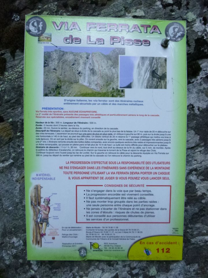 Auf dem Graspfad läuft man stetig weiter hoch ca. 10 m rechts vom Bach Ruisseau de la Pisse zu einer hydrologischen Wasserstandssonde der Fa. Myotis in Échirolles, die über diesen an einem Seil hängt. Vorbei an deren Messdaten-Sendemast überquert man nach ca. 60 m man den Bach von rechts nach links über eine steinige Furt, was nur trockenen Fußes gelingt, wenn die Zeit der Schneeschmelze vorbei ist. Der Graspfad führt zur nahen (von Anfang Mai bis Anfang Oktober) bewirtschafteten Berghütte Refuge des Clots (1512 m). Im Nachbargebäude gibt es sogar Übernachtungsmöglichkeiten für maximal 17 Personen. Westlich von der Hütte trifft man beim Wegweiser Les Clots (1515 m) auf den Fernwanderweg GR 54. Auf diesem weiter in westliche Richtung unsteil durch den Laubwald hinab zum verlandenden Tümpel Lac de Lovitel. Ab hier gibt es für den Abstieg 2 Möglichkeiten: Entweder auf dem GR 54, bzw. Weg-Nr. OBP 343 weiter westwärts hinab bis Mizoën (4 km) und von dort 1,5 km zurück auf der Straße zum Parkplatz (50 min. länger). Oder aber beim Tümpel biegt man links ab (Wegweiser: Via Ferrata retour) zu einer Felsklippe, wo ein Gittermast einer Hochspannungsleitung steht. Dort beginnt dann in östliche Richtung hinab in bewaldete Felsbucht ein Stahlseil und führt über sandig, rutschigen Pfad zu Felsabsätzen, wo es einige Eisenbügel gibt zum Abklettern. Dabei unterquert man die Hochspannungsleitung. Am unteren Ende dieses Abstiegs-Klettersteiges läuft man auf unmarkiertem Pfad durch Gesträuch steil und rutschig hinab, der schon ziemlich verwachsen ist bis zu einer unscheinbaren Gabelung kurz vor dem Bach unterhalb des Wasserfalls. Entweder kann man bei niedrigem Wasserstand dort den Ruisseau de la Pisse überqueren zum nahen Einstieg des Aufstieg-Klettersteigs und auf dem Zustiegsweg wieder absteigen. Oder man biegt scharf rechts ab und folgt dem unscheinbaren Strauch-Pfad südwestwärts hinab zu den Bäumen. Inzwischen erblickt man dann verbleichende rote Striche, des einstigen Zustiegsweges zum Gumpen am unteren Ende des Wasserfalls. Der Pfad führt zu einer Straßenbucht am nördlichen Straßenrand der D 10191 (kleiner Parkplatz). Gegenüber steht ein kleines mit Graffiti beschmiertes Gebäude. Von dort nun ostwärts ca. 300 m entlang der Fernverkehrsstraße über eine Brücke zum Parkplatz zurück (1,5 Std.).