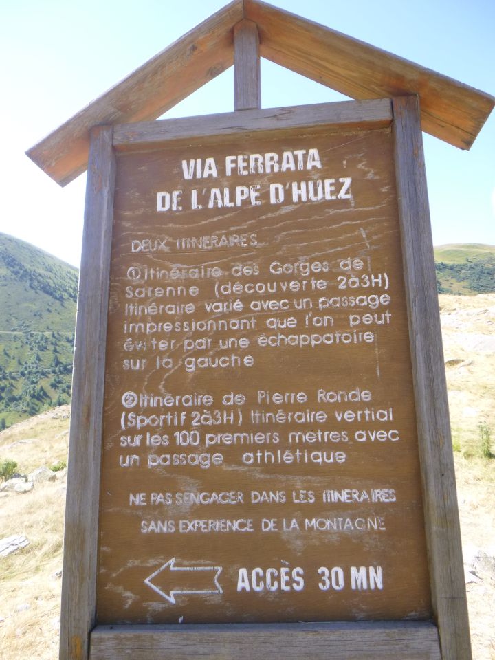 Zustieg: Rechts an weiterführender Straße steht der Wegweiser Pierre Ronde (1845 m). In Richtung Combe Chave, bzw. Le Gua (ockerfarbener Wegweiser), bzw. Via Ferrrata, 1,3 km (dunkelgrüner Wegweiser) beginnt der Abstieg in südöstliche Richtung durch das freie Hanggelände hinunter in beginnenden kurzen, bewaldeten Sarenne-Graben. Vor einem Bachlauf des Combe dreht der spärlich rot-weiß markierte Wanderweg nach Süden ab bis er auf den breiten Fernwanderweg GR 54 trifft (25 min.). Beim Wegweiser vor der Talstation des Winter-Sessellifts Chalvet (1600 m) schlägt man rechts ein (Richtung Huez) und wandert 400 m westwärts am rechten Ufer der Sarenne entlang (5 min.). Ca. 250 m vor dem Bergrestaurant Le Combe Haute (1590 m) biegt man rechts ab (kleines Schild „Ferrata“ am Baum). Nun auf steinigem Pfad nordwärts in 5 min. hinauf zu nahen Wandfuß (1650 m).