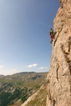 SL2 (30 m 5b). Eine Art Verschneidung hoch und dann gleich ziemlich leicht über Schrofen. Am Schluss nochmal 5 m netter Aufschwung (2 Bh) zum Stand.