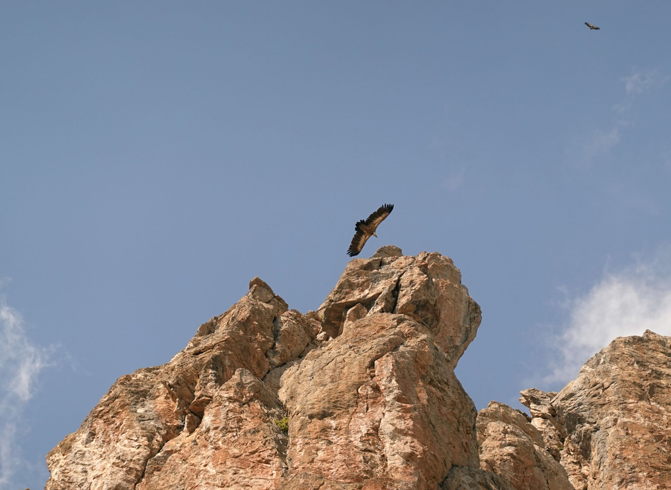 SL3 (25 m, 5a). Die Verschneidung überm Stand hoch und darüber das Band nach hinten zur Hauptwand. (Dieses Stück fürs Abseilen gut merken, man seil dort ab, aber am Stand vorbei zu einem Schlingenbündel ca. 8 m weiter unten. Von dort reichen dann 50 m gut zum Boden..)