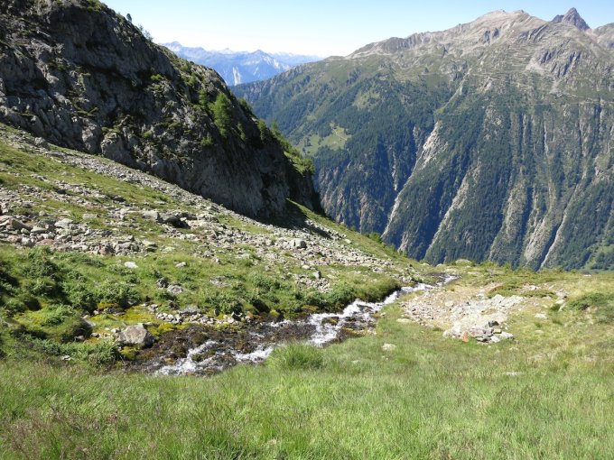 Man erreicht eine verfallene Hütte (Steinmauern) durch die man hindurch geht. Direkt dahinter rechts hinab aber gleich wieder links. Dort über eine kurze Steilstufe (3m, BH, Fixseil) zur Alti Pochi und diese auf etwa 1860m überqueren. 625140/135530.