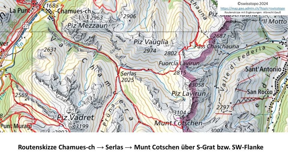 Hinweis: Die Gehstrecke ist relativ lang: Chamues-ch → Serlas 6 km, Serlas → Fuorcla Federia knapp 6 km, insgesamt ca. 24 km hin- und zurück (pure Luftlinie).
