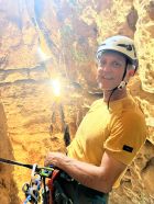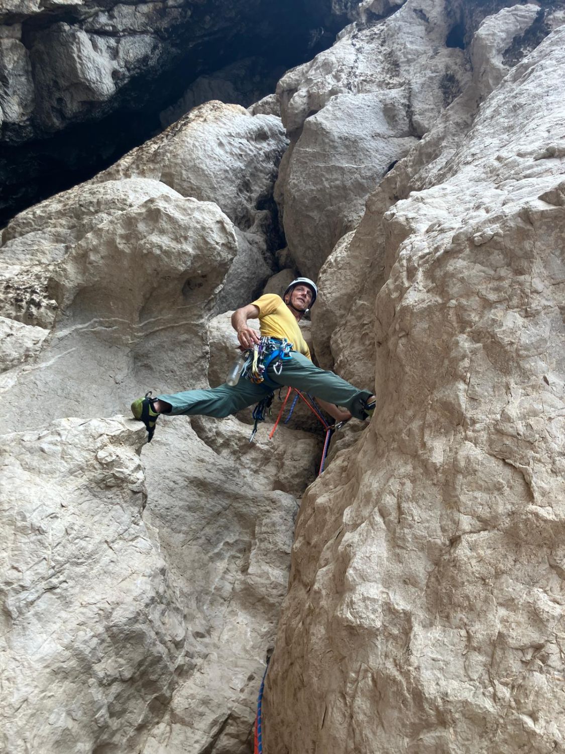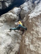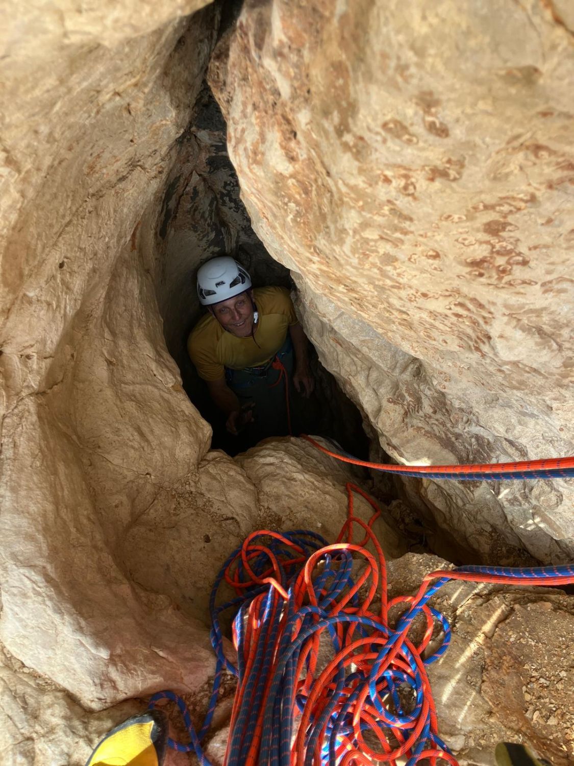 Sl4 25m, 5c: Sehr schöne Sl in gutem Fels, wo mensch zum Abschluss wieder durch ein Loch klettert und in einen breiten (1-2m) Spalt gelangt. Dort gibt es ein Fixseil, das irgendwo hinauf führt (vermutlich einfacherer Ausstieg zum Plateau, dort auch Varianten 2x 5c).