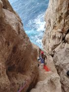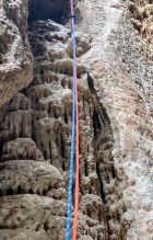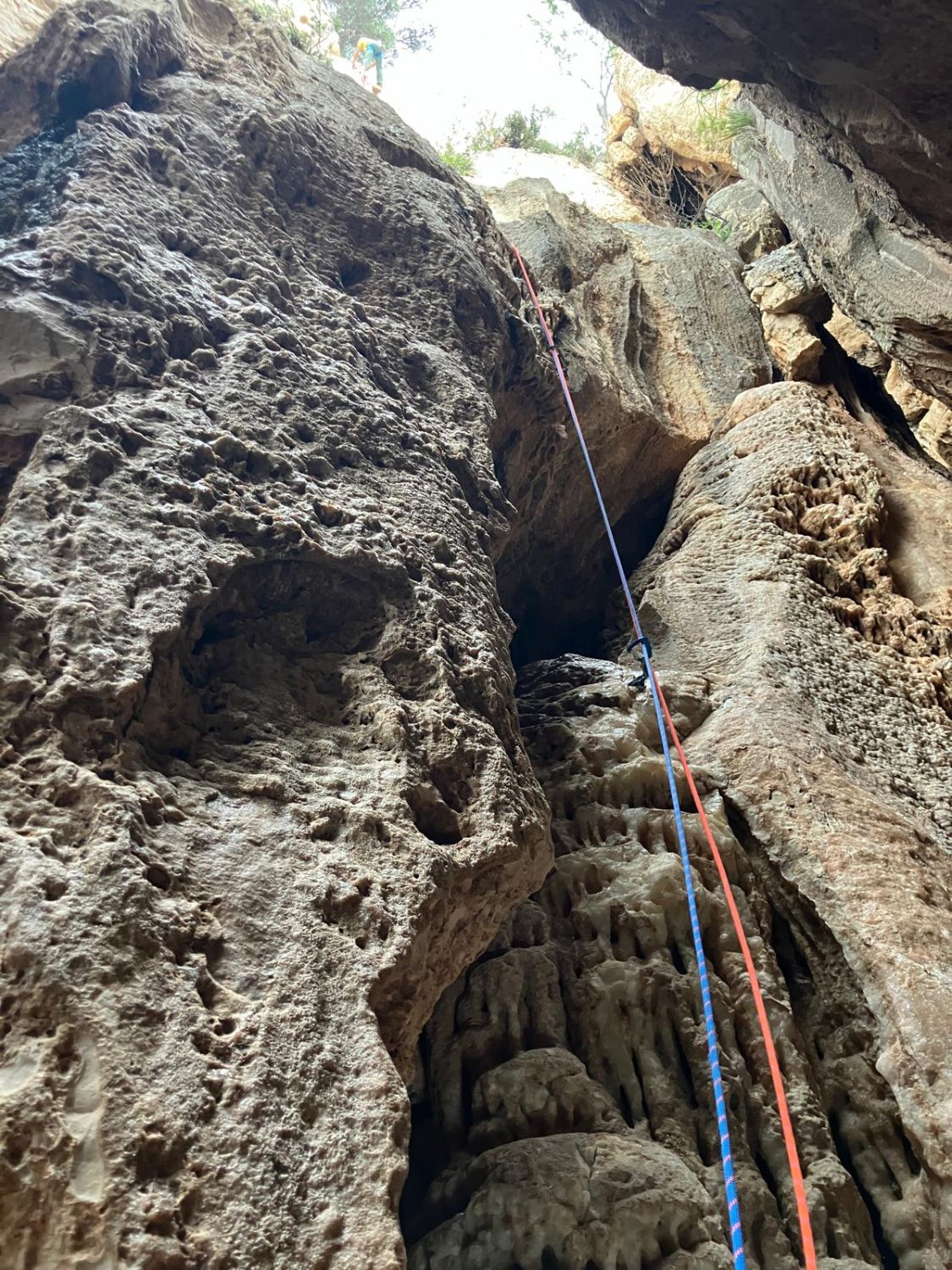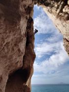 Sl2 30m, 6a+: Nach ergiebigen Regenfällen und durch Gischt war die ganze Sl feucht und glitschig, zudem ist es (naturgemäss?!) etwas sandig auf den Bändern/Griffen. Die Sl ist überhängend und windet sich durch abgefahrene Felsgebilde nach oben. Kurz bevor es ganz in die Höhle geht, stecken 2 Bh nahe, kann als (unbequemer) Zwischenstand genutzt werden. Besser aber noch ca. 10m weiter in die Höhle und zu bequemem Stand auf eingeklemmten Blöcken.