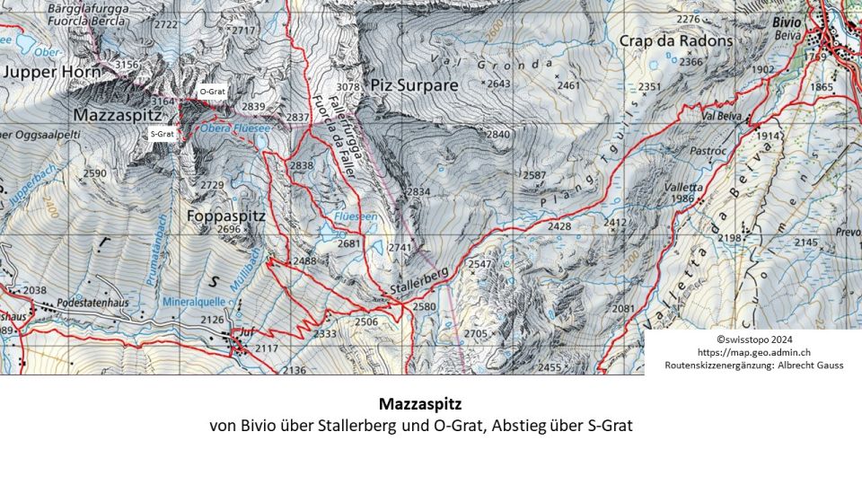 Von Bivio, posta (1769 m, Postautohaltestelle, Zufahrt von St. Moritz Bhf. bzw. St. Moritz Bad Campingplatz oder Tiefencastel, staziun) auf markiertem Wanderweg Richtung Juf zum Stallerberg (2580 m), dort weiter auf markiertem Weg über die Flüeseen (2681 m) zum P. 2838 m hinauf und 40 Höhenmeter (Hm) zum Obera Flüesee (2789 m) wieder hinab. Vom linken (südwestlichen) Seeufer über den angenehm zu begehenden Schuttgrat westlich vom See nach NW aufwärts (rechterhand Steinmänner und Wegspuren) bis auf ca. 2860 m bei einem markanten Steinmann auf dem Gratrücken. In dieser Höhe sind die im unteren Bereich des Gratrückens auf dessen W-Seite vorhandenen Felsabbrüche nicht mehr vorhanden und es kann auf das Schuttfeld unter der SO-Wand auf Wegspuren horizontal nach W gequert werden. Für den S-Gratanstieg muss das ganze Schuttfeld auf der Höhe von ca. 2860 m nach W gequert werden und zwar in Richtung des Sattels im S-Grat (exakter SSO-Grat) nordwestlich von P. 2941 m, am Ende unter einen markanten Grataufschwung.