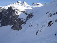 Gleich wie Aufstieg. Ab Punkt 2232 können verschiedene Varianten gefahren werden. Die Nordhänge haben meist guten Pulverschnee und sind recht sicher, da sie im Winter oft befahren werden.