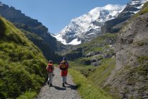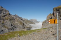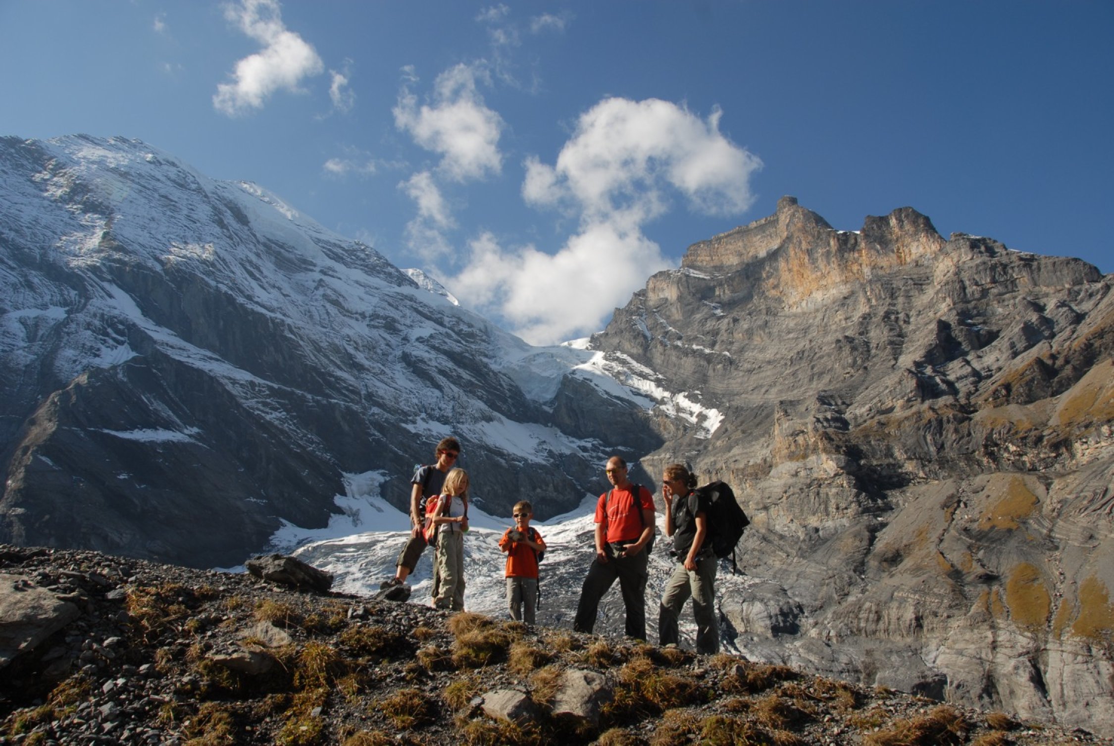 der Schlucht auf gutem Weg ins Gamchi zur Alphütte Pt. 1672. Nach SE weiter über Alpweiden zur markanten Felswand. Über ein Felsband führt der Bergweg durch diese Wand. Der Weg ist auf 100m etwas exponiert und nass, dafür immer schön breit und z.T. mit Halteseilen gesichert. Kinder an der Hand führen oder anseilen. Nachher wieder durch offenes Gelände über zwei Holzbrücken, Sillere und über die Moräne hinauf zu Wegweiser Pt.2107. Nun wieder steiler nach SE hinauf zu Wegweiser Pt. 2331 und wieder flacher zur Gspaltenhornhütte.