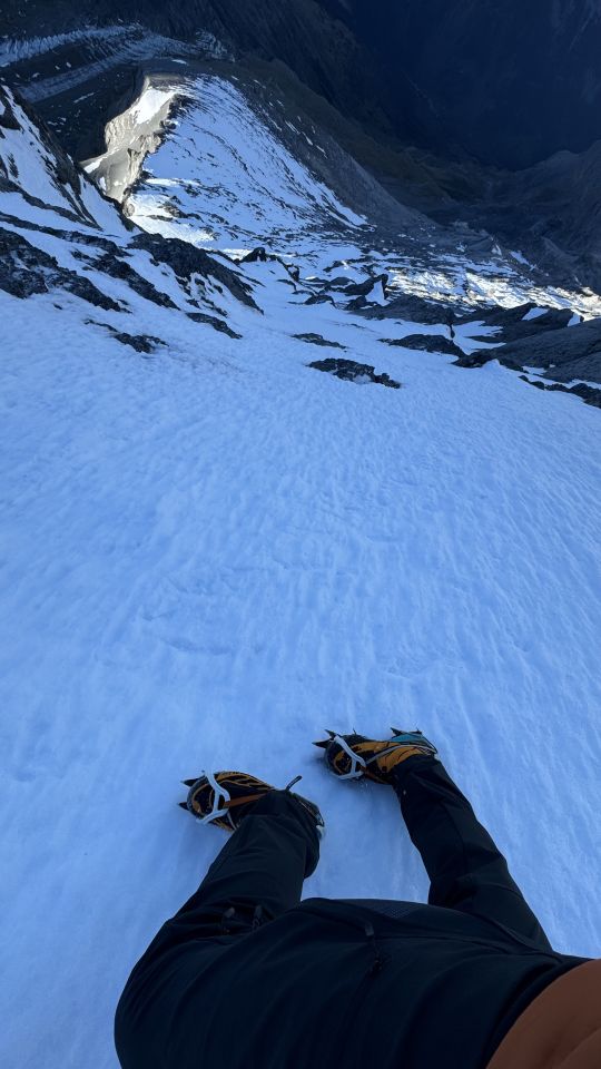 Herrlich, perfekter Firnschnee bis zu den Fixseilen, und weiter. BH und Eisenstiften wahren kaum zu sehen sind wahrscheinlich unter dem Schnee. Sind unterhalb der Jungfrau gestartet, Wind technisch und Startplatz war “leider “ schon zu gut