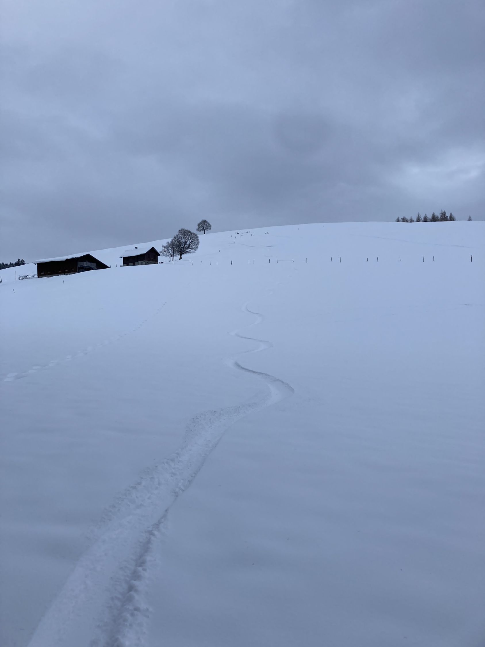 Mit dem Snowboard über Schönboden, Blattenweid nach Fliegenberg. Danach rechts haltend in die Geländemulde bei Taulen.