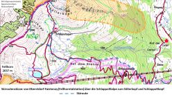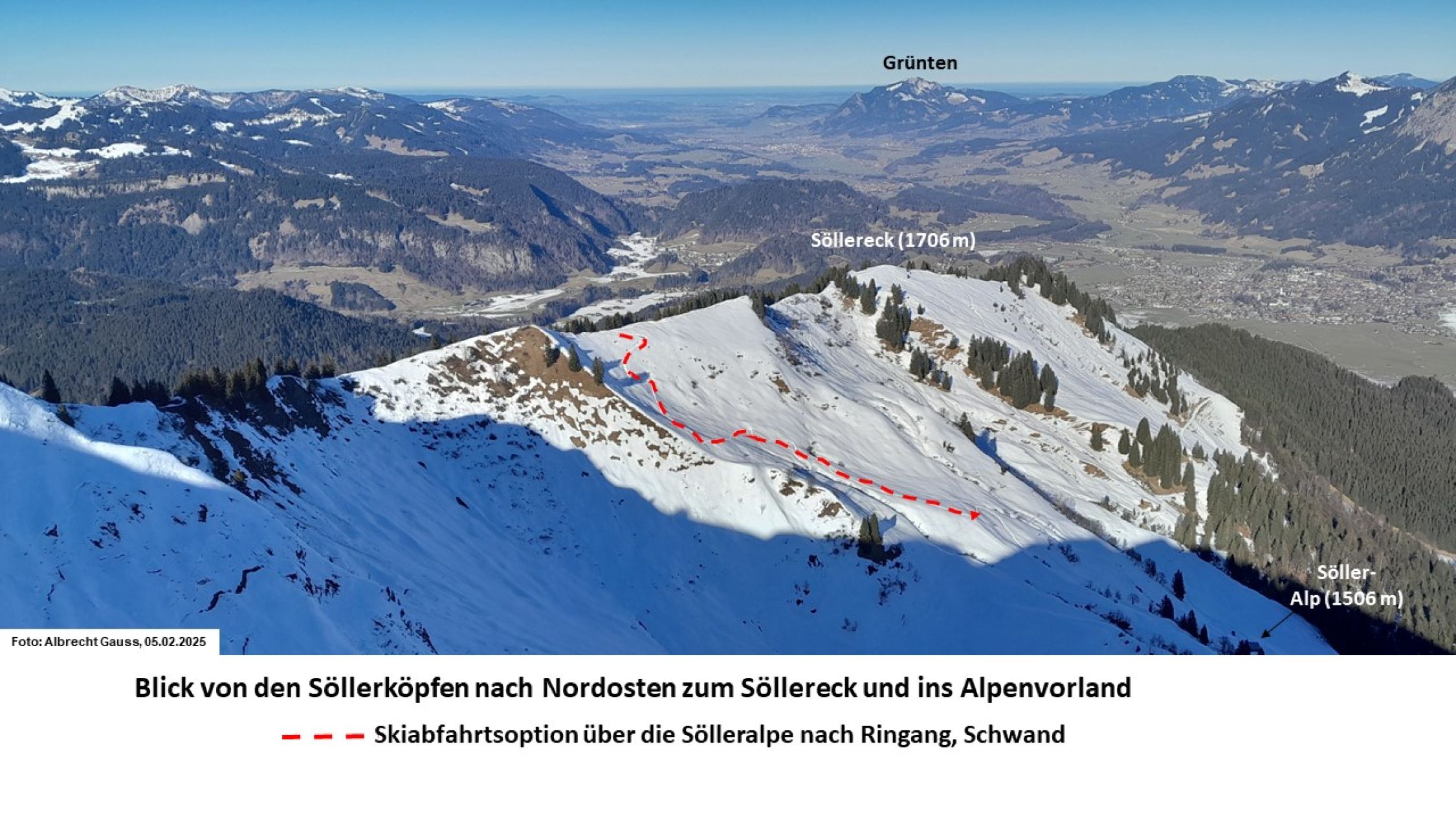 - vom Schlappolteck (P. 1924) nach NNO und auf ca. halber Strecke des Kamms zum Söllereck nach O zur Sölleralpe (1522 m) und nach Ringang (963 m)/Schwand abfahren (s. Foto). Von Ringang kann man zur Bushaltestelle Skiflugschanze gehen und mit dem Bus 7 nach Oberstdorf fahren.