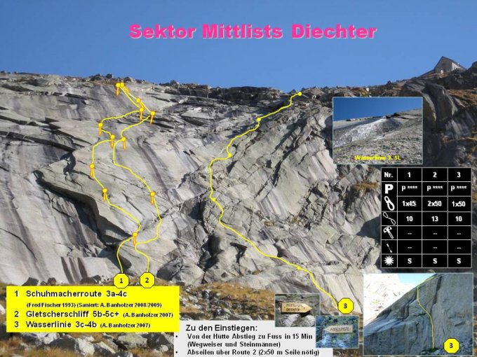 Von der Gelmerhütte in ca. 20 Minuten absteigen zum Einstiegen oder Abseilen über die Route Gletscherschliff oder Schuhmacherroute.