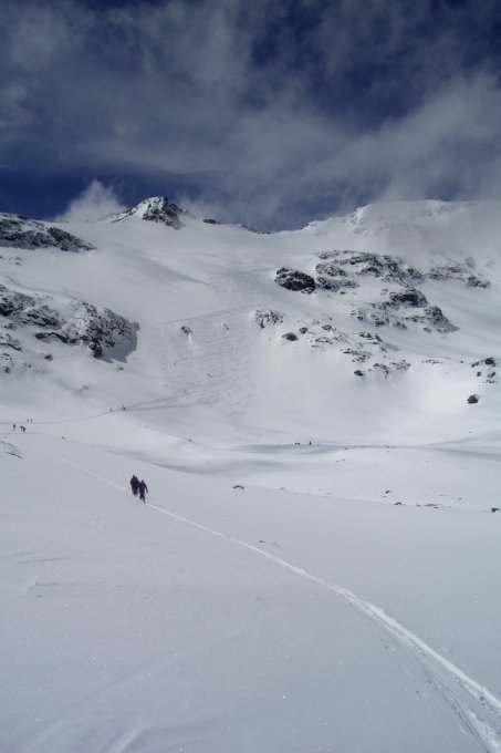 Von Jungen folgt man dem Weg ins Jungtal 2387m. Weiter steigt man über den Junggletscher zum Jungtaljoch 3220m. Von hier quert man den Brändjigletscher und traversiert bei guten Verhältnissen bei 3100m direkt zur Pipjilücke, ohne wieder aufzusteigen. Sollten die Verhältnisse dies nicht erlauben, fährt man den Brändjigletscher hinunter ins Brändjitälli und steigt hier den Holesteigletscher wieder hoch zur Pipjilücke3050m. Von hier fährt man runter zu Punkt 2919m und weiter zur Turtannhütte.rückblick im aufstieg zu p.3302