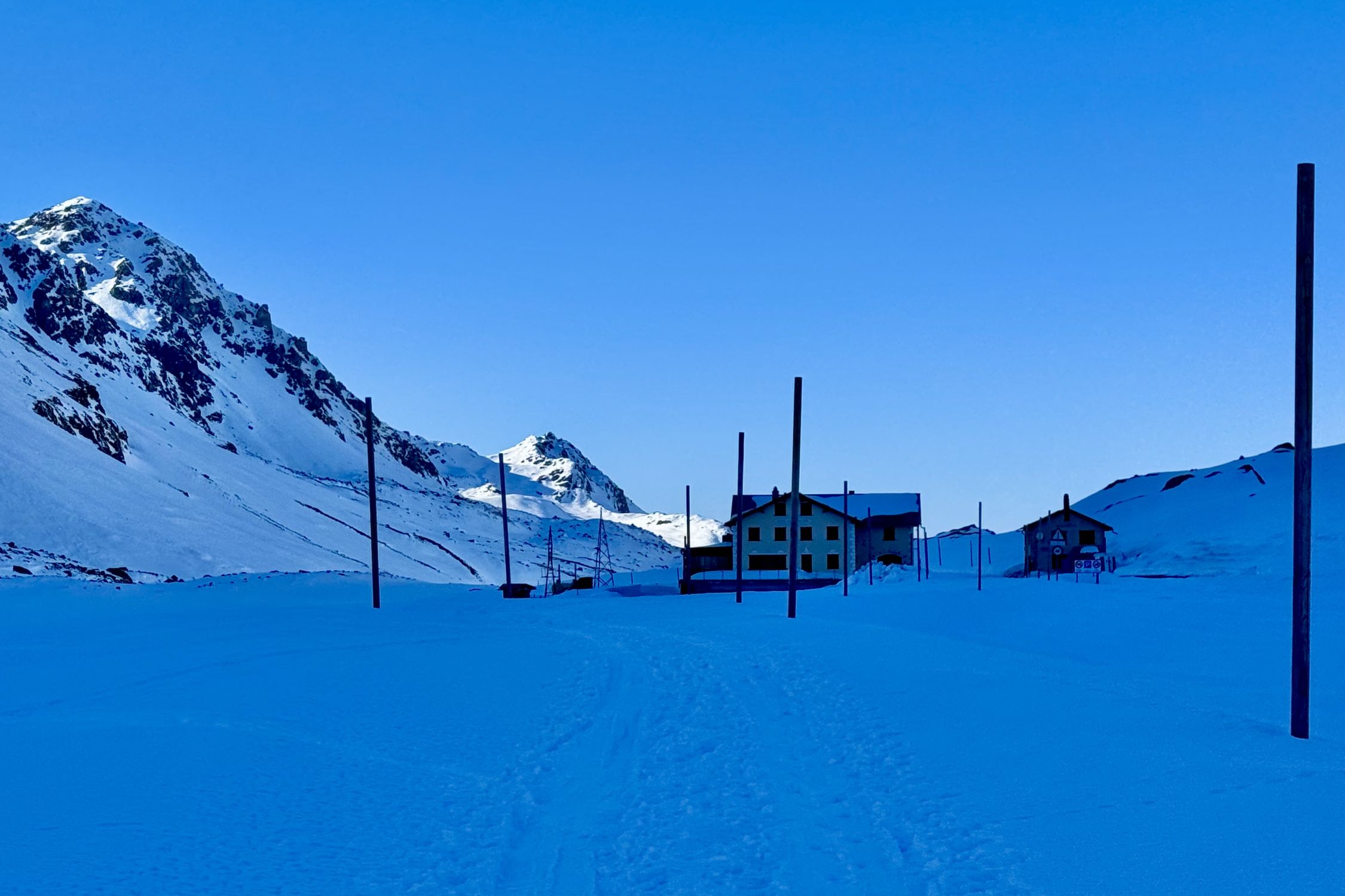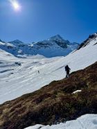 Zurück beim Skidepot geht jetzt mit Skiern steil runter ins Engadin, Richtung Westen. Das Tal rausfahren Richtung Süden zur Passstrasse bei Chant Sura.