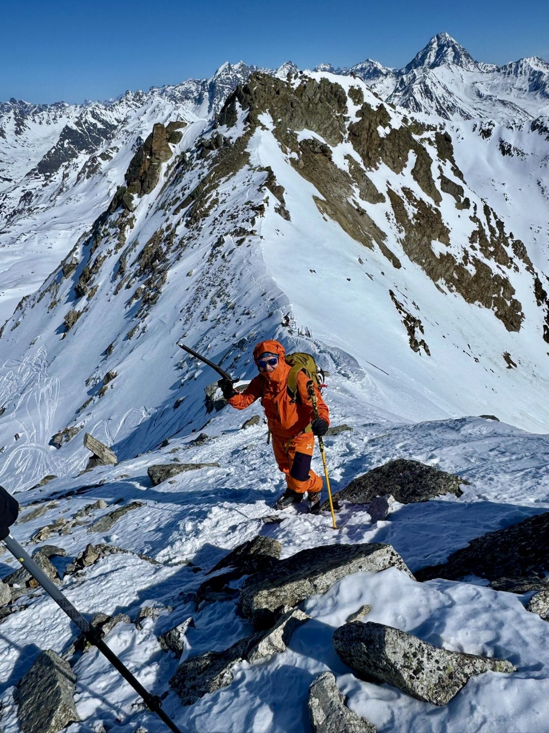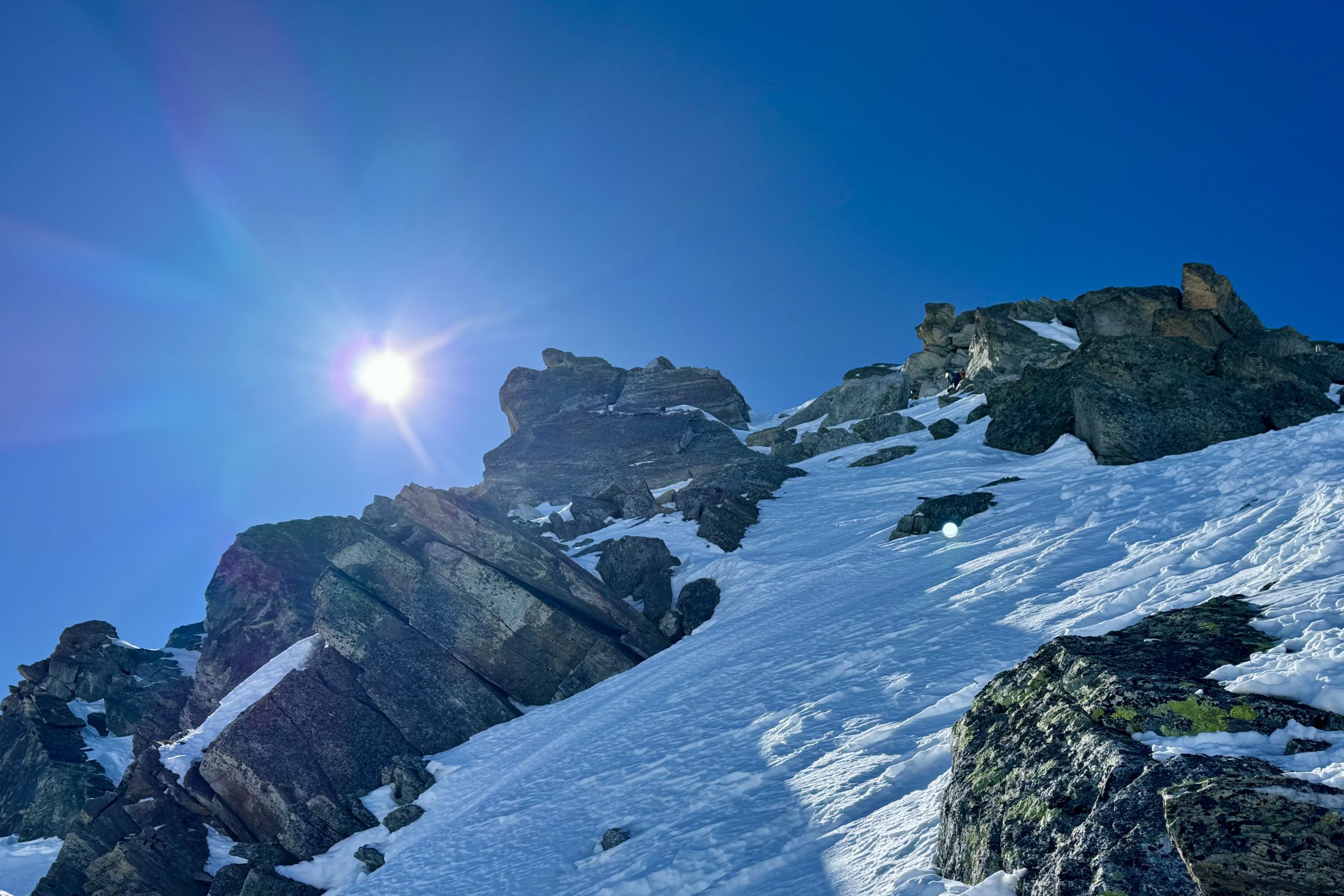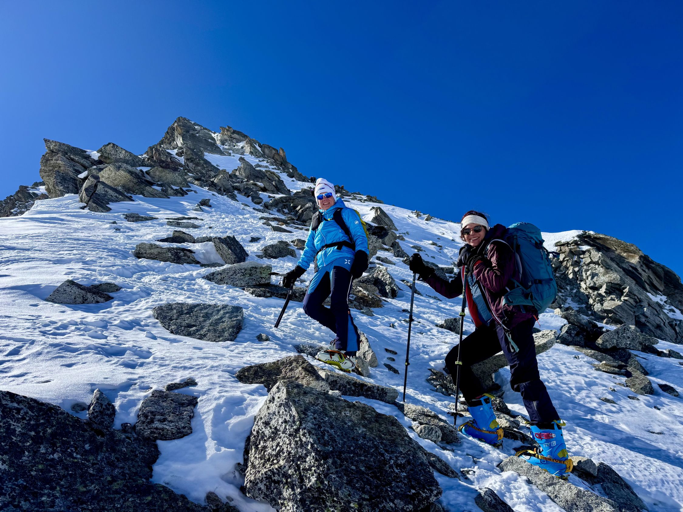 Mit Steigeisen und Pickel gehts weiter den steilen Nordost-Grat hoch. Meist sind gute Trittspuren vorhanden, da dieser Berg viele Besucher geniesst.