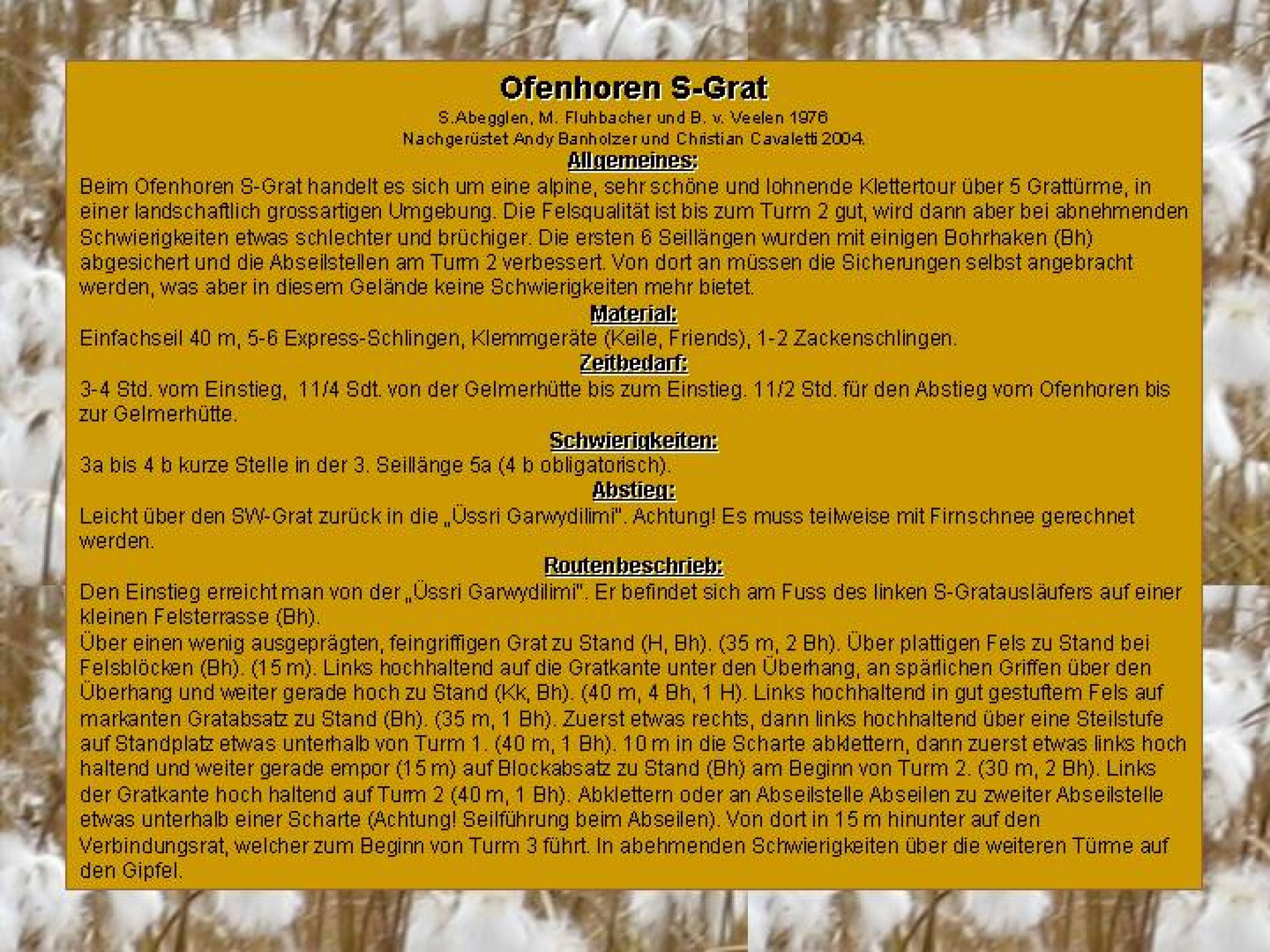 Grossartige Überschreitung über die Grattürme in einer landschaftlich wunderbaren Umgebung. Der erste Aufschwund wurde 2004 sanft saniert. Die restliche Überschreitung ist in alpinem, leichteren Gelände und muss selbst abgesichert werden
