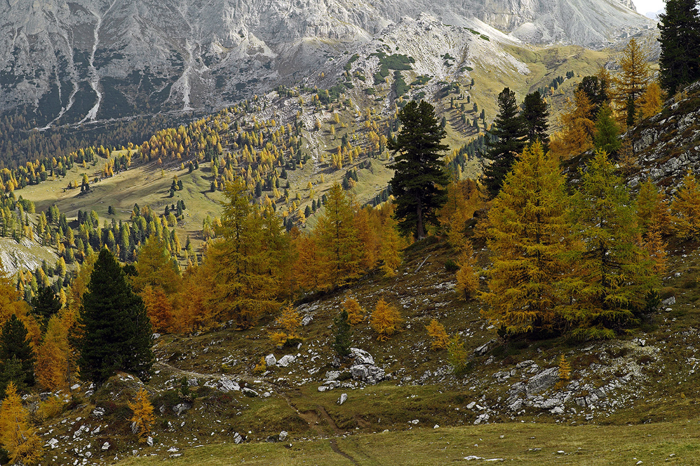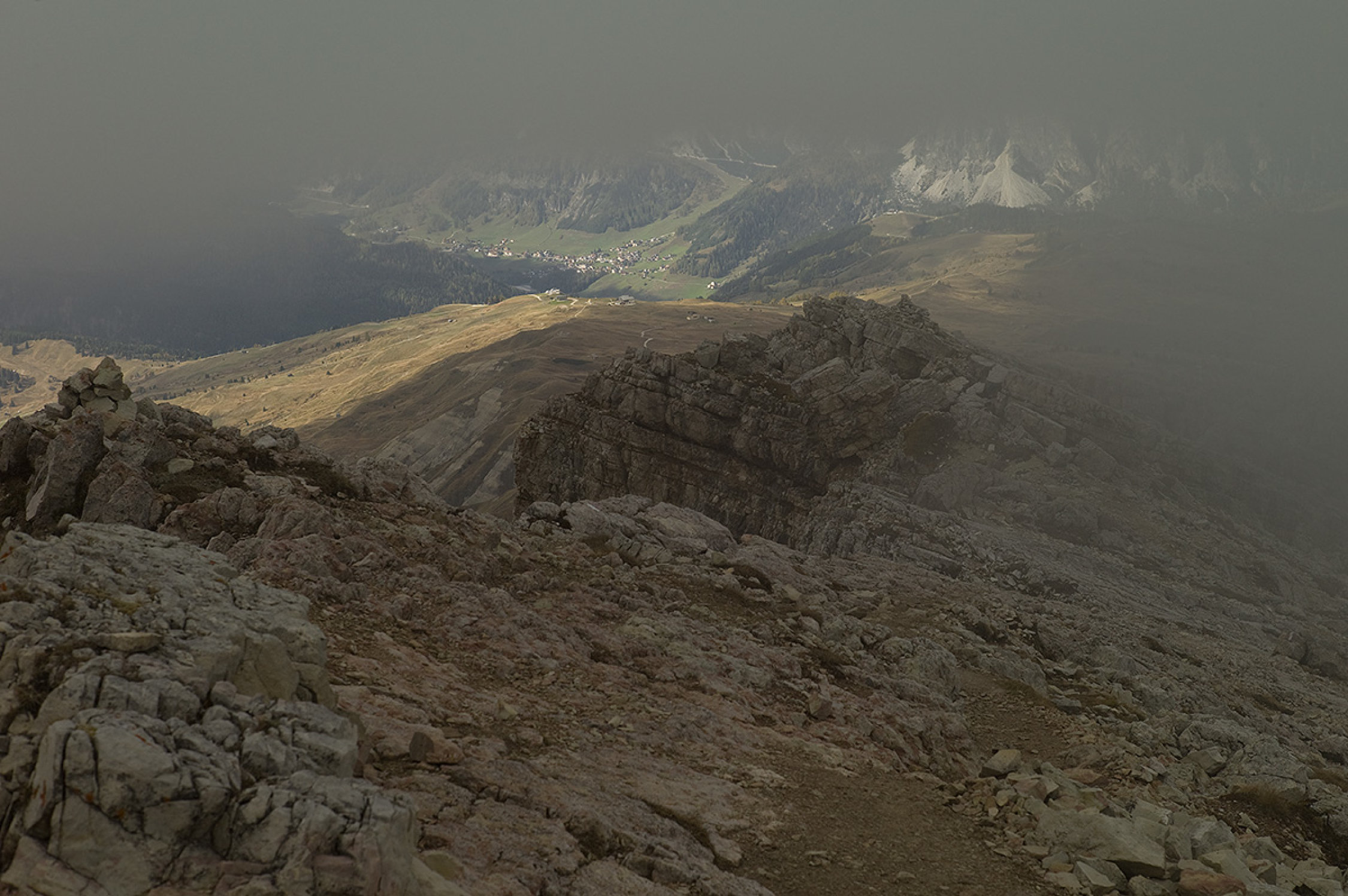 Vom Rifugio Valparola (2168 m) etwas nördlich des Passes umgeht man den kleinen See auf der Westseite und folgt anschliessend dem aufwärts Richtung der kleinen Erhebung des Piz Ciamp führenden Pfad. Südlich dessen quert der Pfad erst leicht ansteigend an Stellungsresten vorbei, dann mit etwas Höhenverlust in den mit schütterem Nadelwald bestandenen Kessel von Borat. Der Kessel wird gänzlich gequert zum kleinen Tälchen Vallone Pudres, die Wegspur zieht anschliessend den Hang hoch zum Punkt 2330 im Nordwestrücken des Setsas.