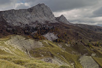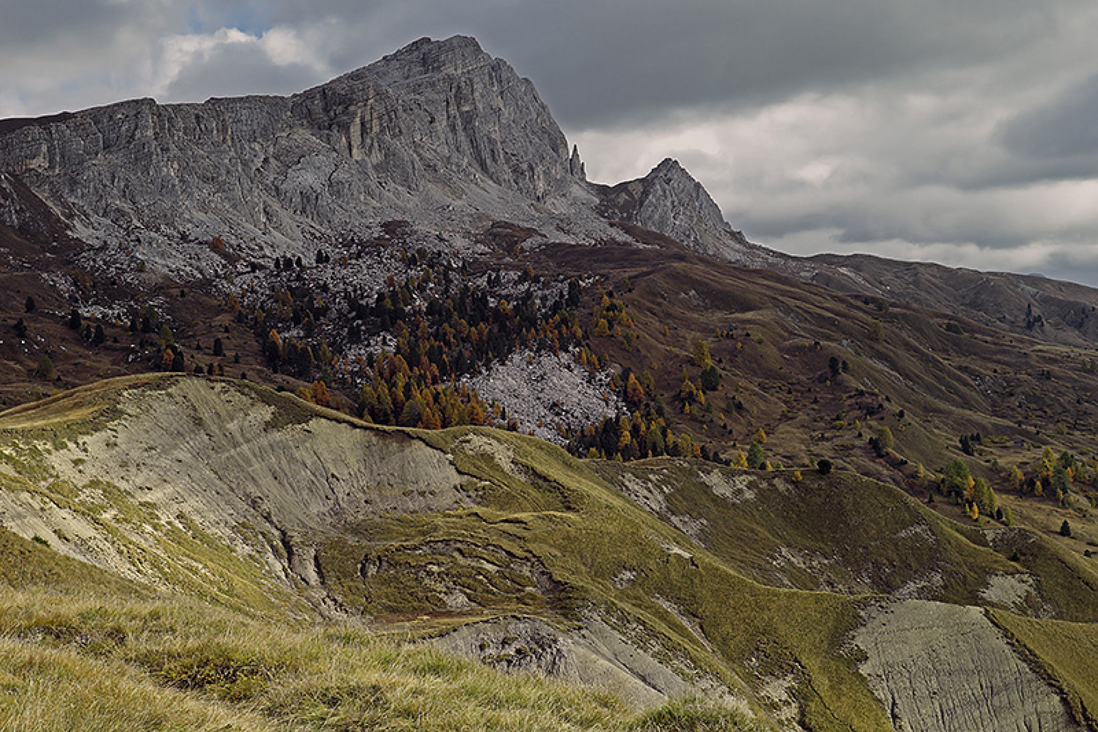 Nun hält man südostwärts auf Pfadspuren der wenig ausgeprägten Weidekuppe folgend hinüber zum hier noch begrünten Ansatz der Wandfluchten des Setsas. Über eine steilere Gras- und Schuttflanke steigt man daraufhin auf Pfadspuren zur Grathöhe empor. Der Gratkuppe in südlicher Richtung folgend trifft man bald einmal auf den aus dem Kessel von Borat, also vom Passo di Valparola her kommenden Weg.