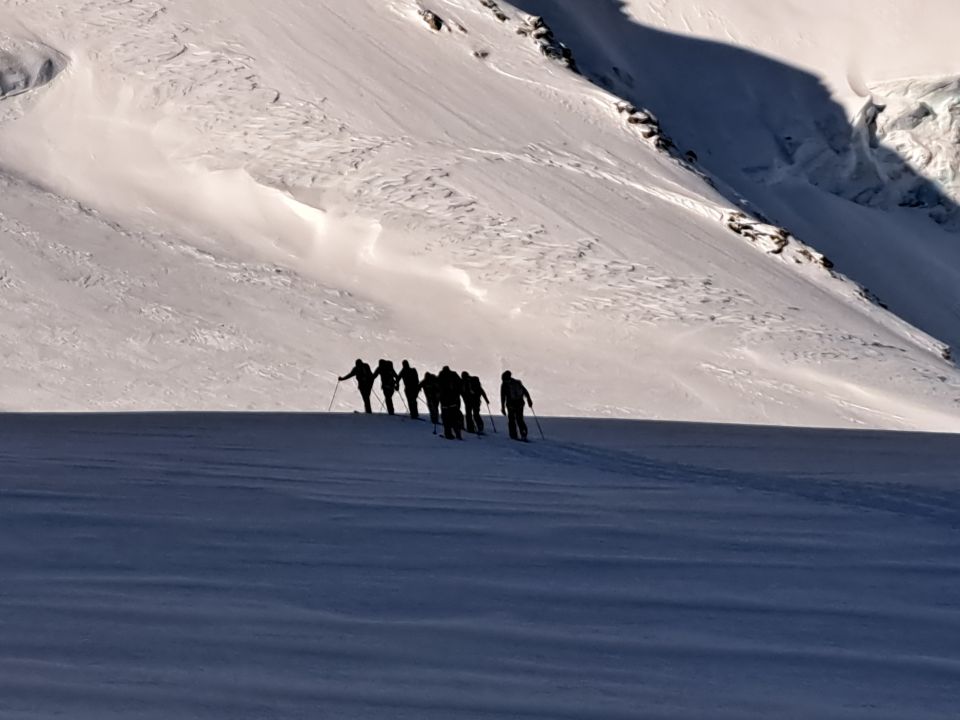 Von der Diavolezzatalstation über die Skipiste hoch und Abfahrt zum Persgletscher. Weiter über normale Route zum Palüostgipfel und Hauptgipfel. Kurze Abfahrt bis unmittelbar vor den Spinasgrat. Absteigen, abseilen oder abfahren in die steile Südostflanke. Abfahrt bis an den Wandfuss und weiter bis unter die Fuorcla Bellavista. Bei der Fuorcla wieder in die Schweiz einreisen und auf der Normalroute zum Bellavista Mittelgipfel. Zurückfahren bis 3700m und dann die Einfahrt in die Foura zwischen Spalten suchen. Weiter durch die steile Foura (bis 45°) zum Morteratschgletscher (Achtung Eisabbrüche). Weiter unten bis zum Ende des flachen Morteratschgletschers und weiter so weit der Schnee reicht. ? Rest zu Fuss bis Morteratsch Bahnhof.