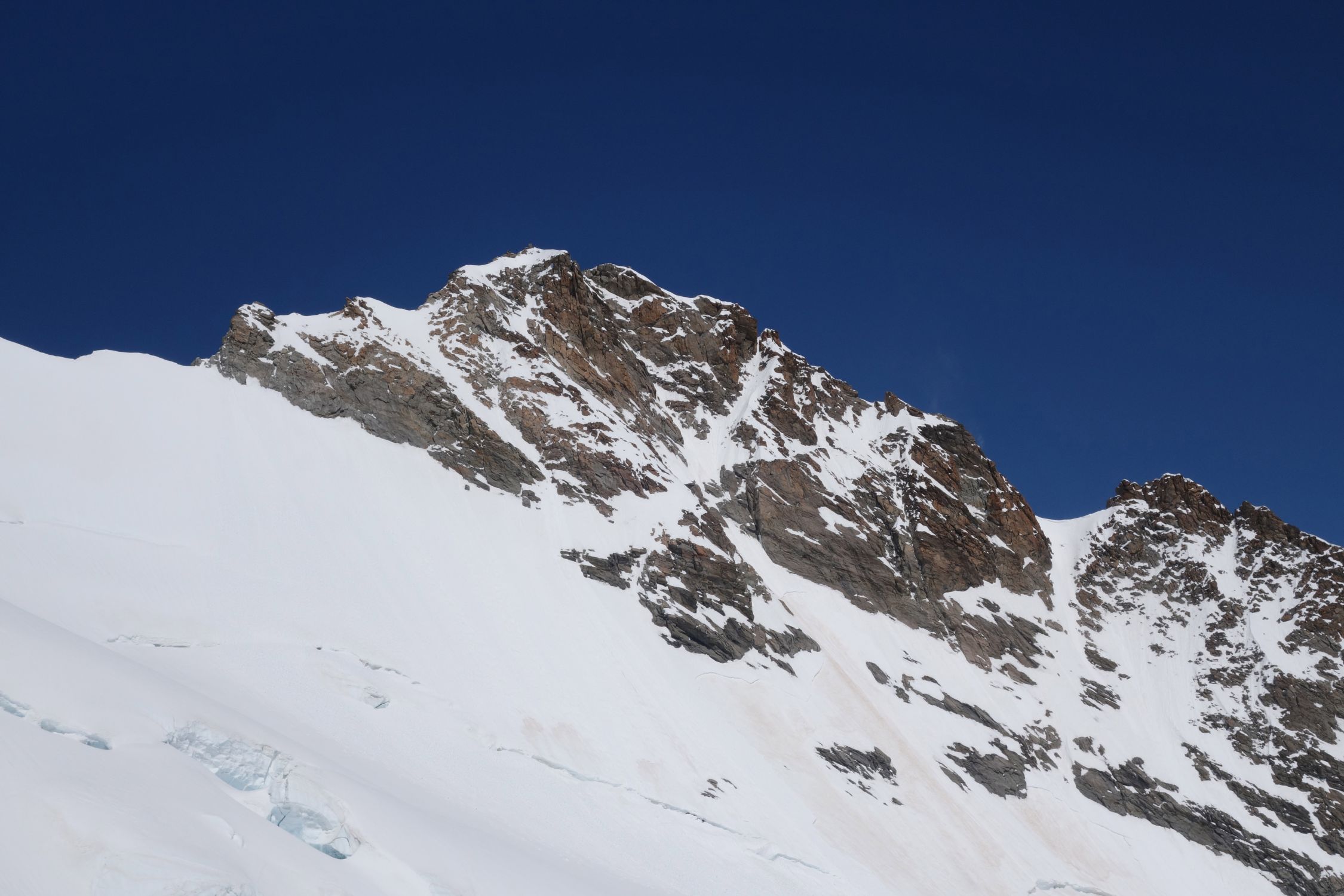 Vom Jungfraujoch via Louwitor (3658 m) über den Col P.3630 und den Nordgrat des Gletscherhorns aufsteigen bis kurz unter den Bergschrund unter der Felsspitze P.3863 m. Unterhalb dem Bergschrund bleiben und in die Mulde unter der E-Flanke traversieren (bis 35°). Die E-Flanke (60 Hm, bis 47°) nach S traversieren um die markanten Scharte (3880 m) unterhalb des SE-Grat zu erreichen.
