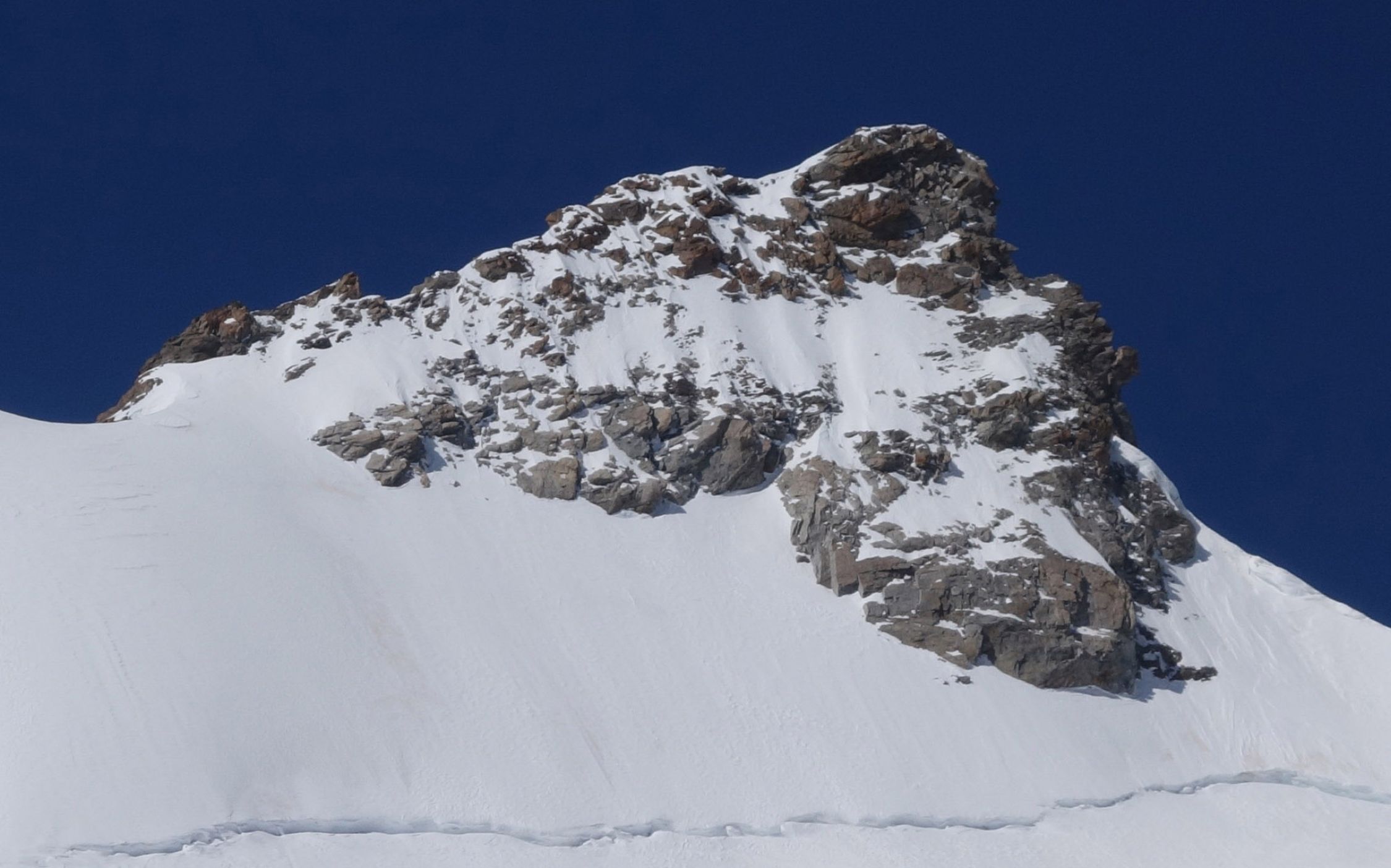 Über den SE-Grat, meist solider Gneis (III) (Chamonix Qualität) zum Gipfel (1h ab Scharte).