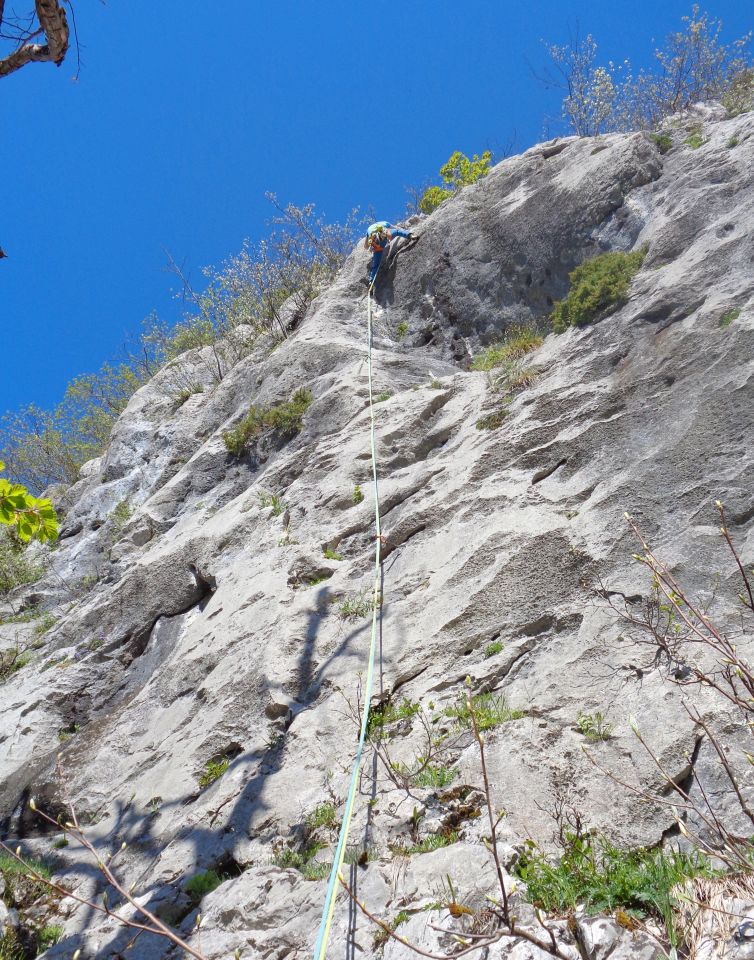 Die Route hat nach SL4 ca. 100 m Aufstieg in einfachen Schrofen (Seil weg, Zustiegsschuhe hin) bis zu der sehr klaren Platte (SL5). Diese ist zwingend 6c, nicht mild bewertet und hat ca. 4 m Bh Abstände. Die Kletterei ist wie auf manchen Granitplatten (komplett strukturlos, keine Käntchen).