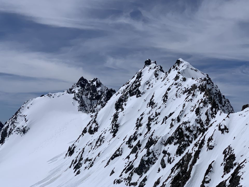 Auf dem Grat dann meist schöne, teils sehr exponierte Abschnitte mit guten Fels, im Wechsel mit messerscharfen Firnschneiden. Westseitig immer gut tragend, ostseitig expositionsgerecht weich (ZS, II, eine Einzelstelle am Challard III).
