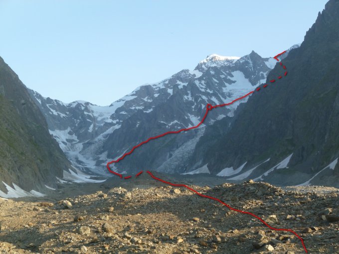 Vom See auf die grosse westliche Seitenmoräne des Miagegletscher, ihr aufwärts folgend bis sie an die Hänge des Mont Suc stösst. Hier nun auf den riesigen, schuttbedeckten Eisstrom wechseln und ihn ca. in der Mitte talein verfolgen. Oder direkt die Moräne überscheiten und hinunter zum Schutt bedeckten Gletscher absteigen.
