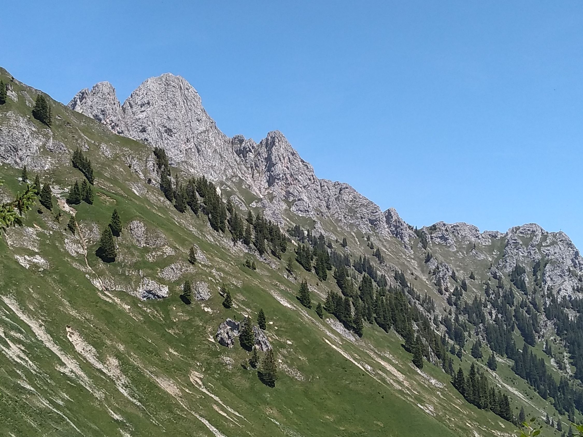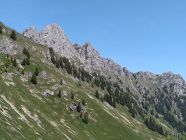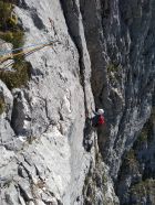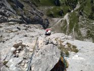 Erste Seillänge über Gras und Schrofengelände leicht. Immer den Haken folgend. Es sind viele vorhanden, so dass man die Route eigentlich nicht verfehlen kann. Plaisirmäßige schöne Kletterei auf tollen Aussichtsberg.