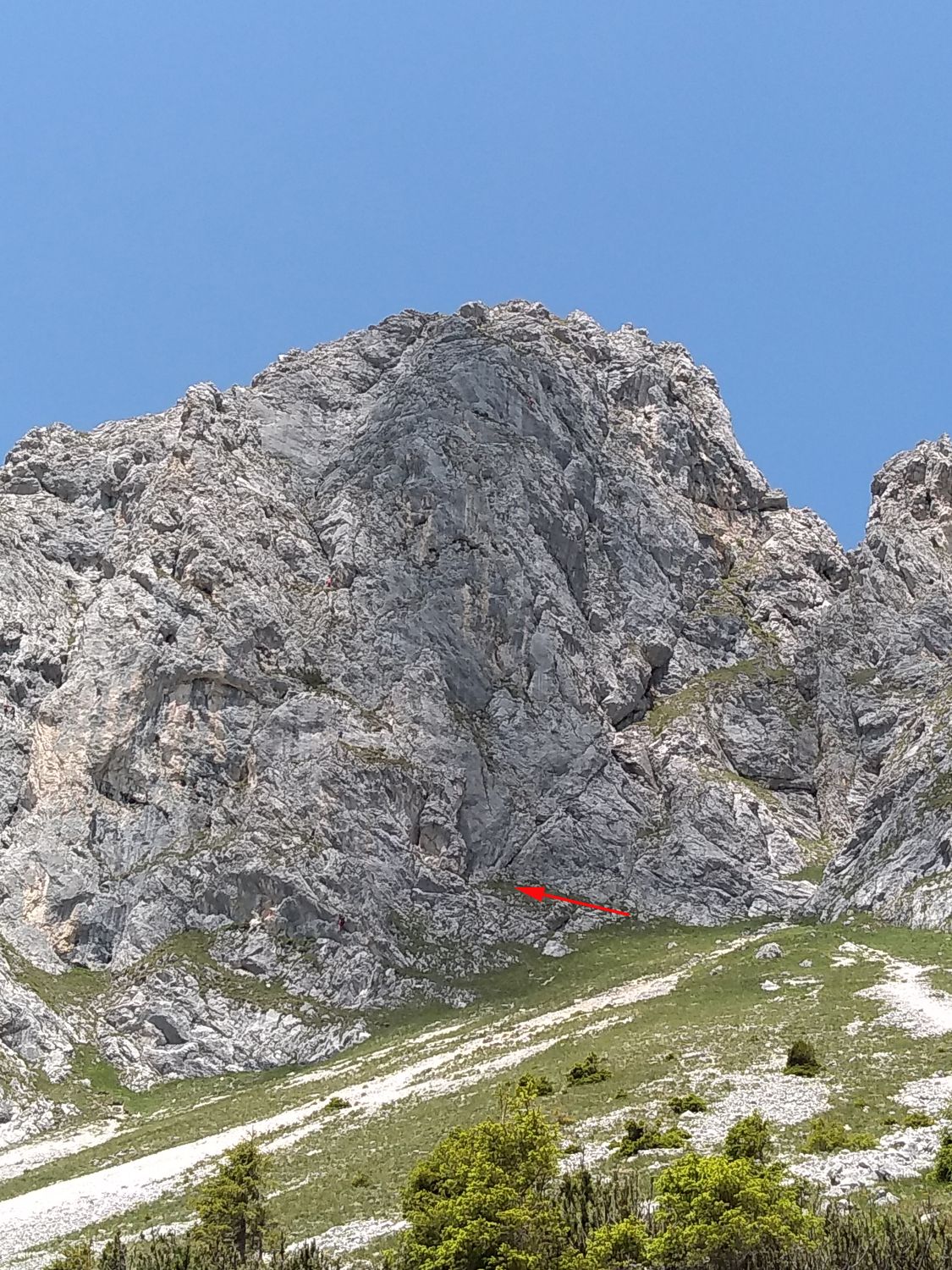 6 SL homogen im oberen 6. Grad in sehr schöner steiler Kletterei. Immer den ausreichend vorhandenen Haken folgend. Vom Ausstieg links eine Grasmulde hinab zu einem Fixseil, das einen links zur Abseilpiste führt. 3 mal mit Doppelseil teilweise steil abseilen zum Einsteig.
