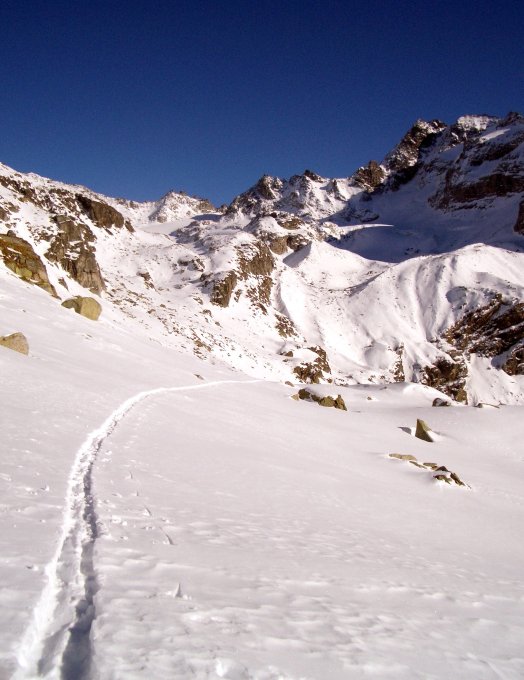 Von der Mittlenberghütte folgt man dem flachen Absatz bis zum grossen Hang, von wo man zur Hütte aufsteigt. Nun leicht absteigend auf die Lengi Egga. Nun immer am Fusse des Mittlenberg-Südhangs (nicht in den Hang einsteigen - mühsam!) in gerader Linie zum Hohsandjoch. Dieses überschreitet man am Einfachsten über die Lücke westlich. Den Hohsandgletscher auf gleicher Höhe nach Süden traversierend gewinnt man den Fuss des E-Grates. Ein kurzes Steilstück führt auf den Grat (Vorsicht bei schlechten Verhältnissen!) Diesem folgend mit den Skiern bis auf den Gipfel.