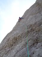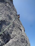SL5: den offensichtlichen und einfachen Kamin hoch, danach sehr schöne Steilplatte (Im letzten Stück leicht R halten, dann auf Band nach L zu Stand.