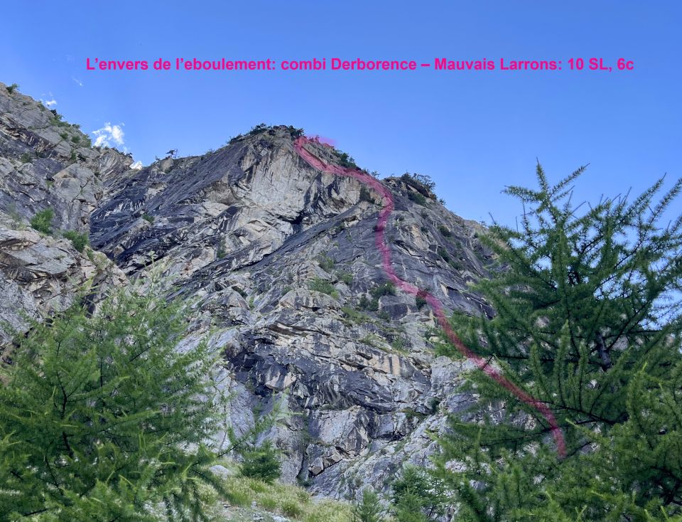 Es handelt sich um eine Kombination von Routen (combi Derborence – Mauvais Larrons - Fukushima-Baliverna). Man kann das auf unterschiedliche Weise zusammenstellen, da über den Pfeiler 4 Routen im Zickzack verlaufen. Insgesamt sind alle gut gesichert und bieten tollen Fels (eher steil). Durch die SO-Ausrichtung gibt es auch im Sommer am Nachmittag Schatten (im Herbst gibt es frühe Sonne). Einige Passagen sind spektakulär gut. Der Abstieg durch Abseilen ist sehr schnell und einfach.
