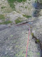 SL5 (40 m, 6b+): Spektakuläre Steilplatte entlang einem Quarzriss). Crux nach ca. 1/3, aber mehrere tricky Stellen.