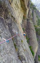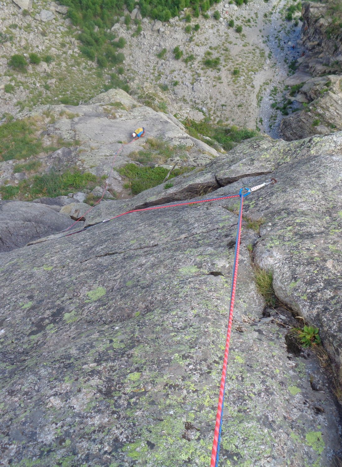 SL10 (30 m, 5c): An der Kante leicht aber moosig zum Band, dort nach L in Verschneidung (2 Bh, einfach. Die Verschneidung ein paar m nach oben, tricky, etwas botanisch, dann nach R in die Steilplatte und dort einer Rissspur entlang (2 Bh) nach oben. Stand an Abseilringhaken an der Kante. Achtung: dort nicht abseilen! Stattdessen 15 m waagrecht nach R zu großem Baum vor steiler Granitwand queren. Dort kann man sehr einfach zum Top von Baliverna abseilen (eine Schlinge opfern). Alternativ quert man nochmal 20 m weiter (leicht nach unten) zu Abseilstand von Derborence (leicht sichtbar. Am Beginn des soliden Felsaufschwungs).