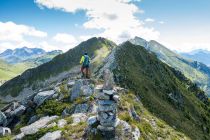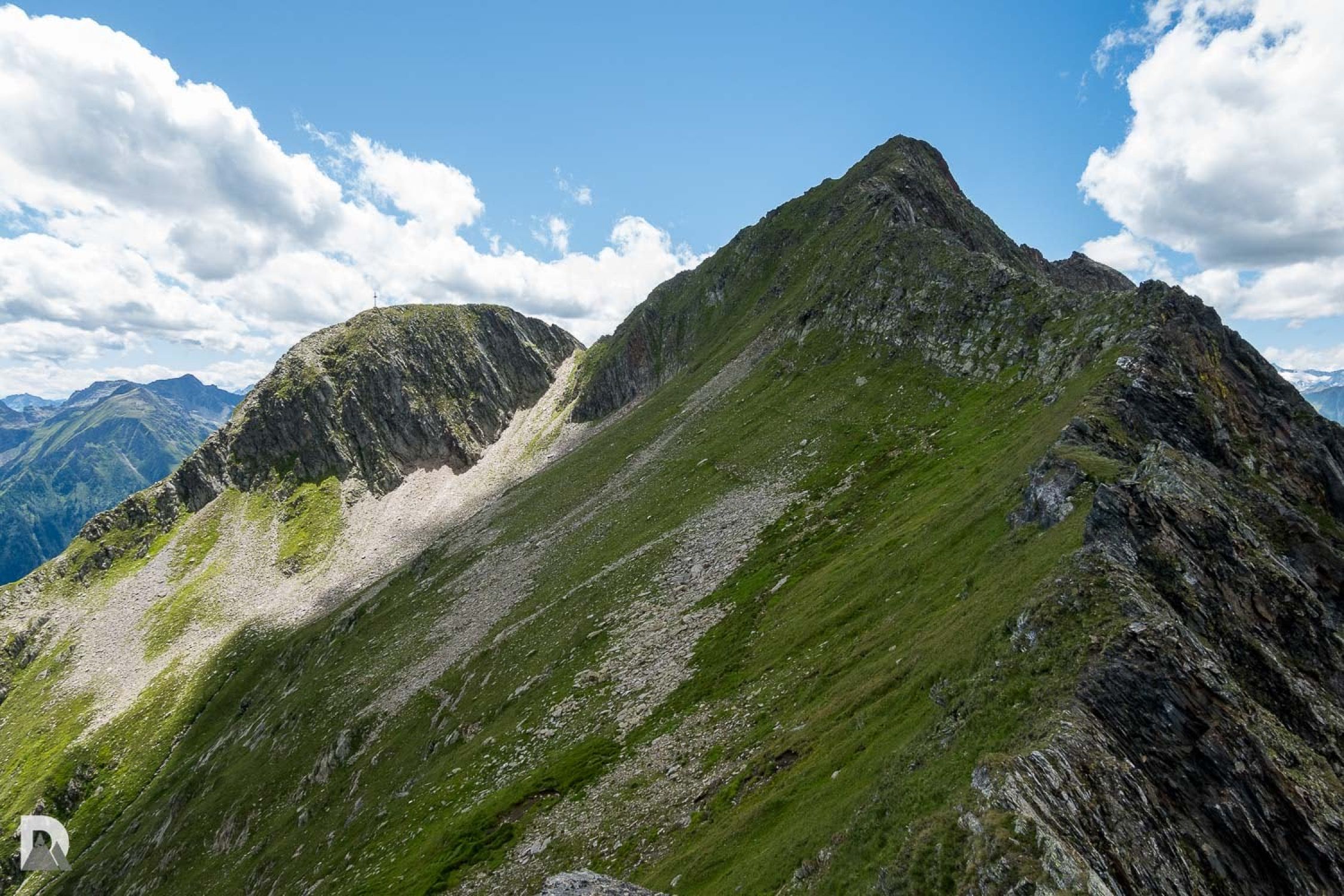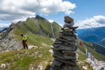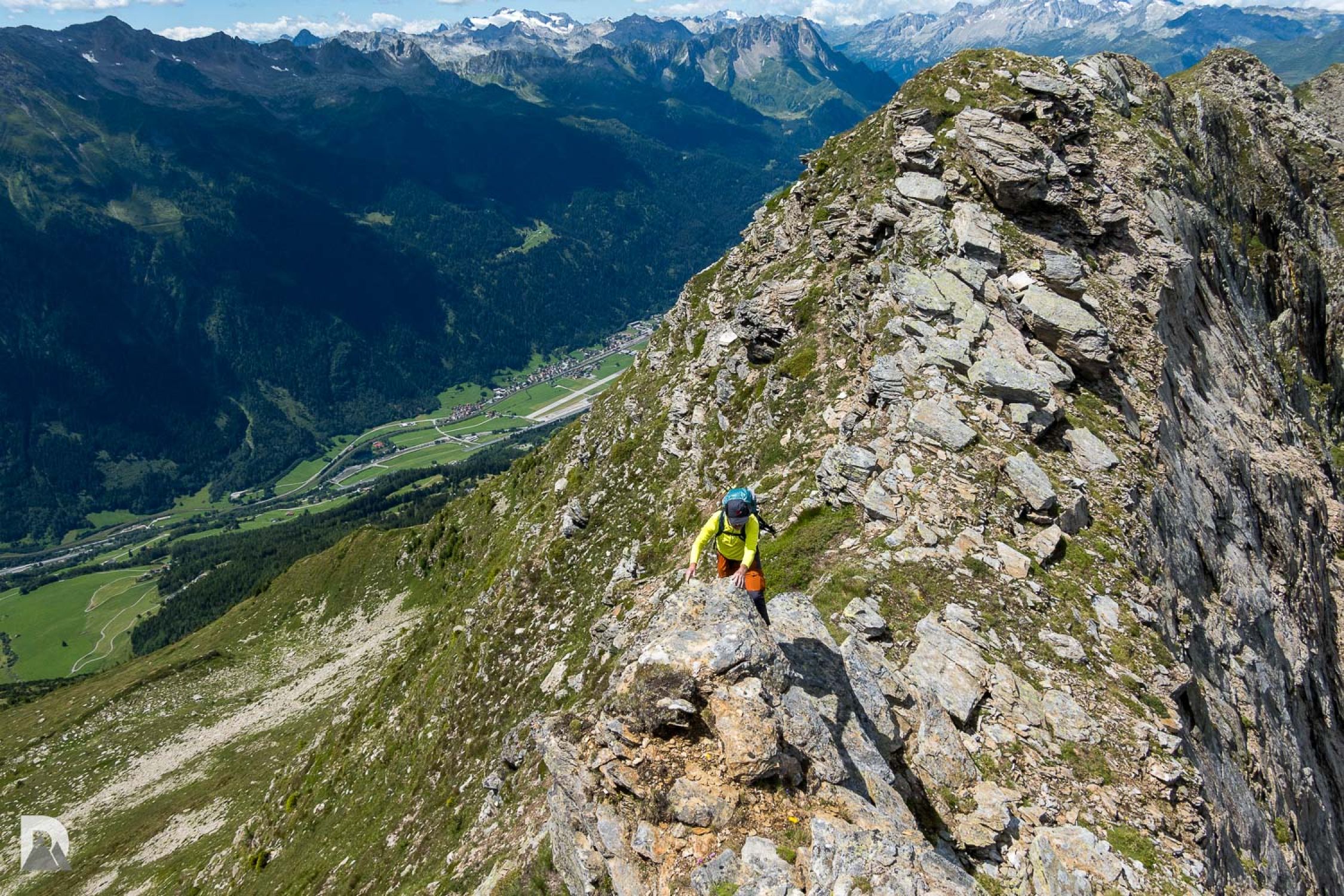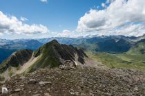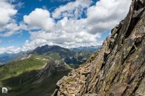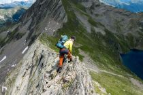 Nach dem Pass Comasnengo meistens direkt am Grat mit diversen Aufschwüngen T5 auf den Pecianett. Der Abstieg direkt am Grat ist heikel, evtl. besser in die Südseite auf Wegspuren ausweichen.