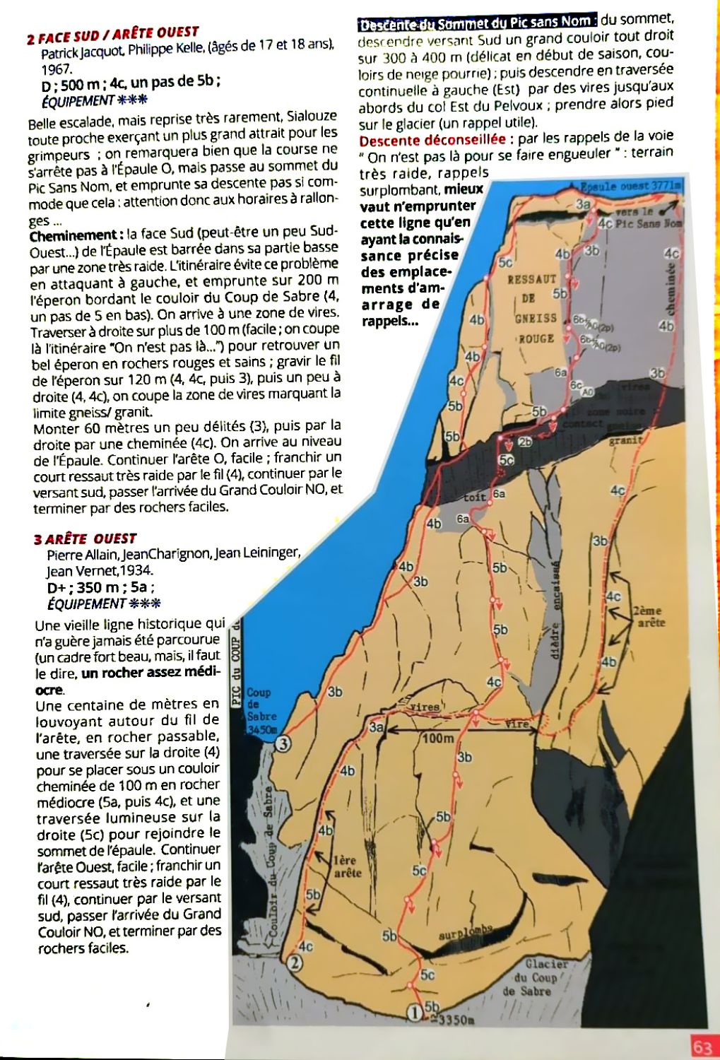 Vom Refuge du Sélé nach NW auf den östlichen Arm des Glacier du Coup de Sabre. Aufsteigen bis zum Fuss des Couloirs welches vom Coup de Sabre herabzieht. Einstieg rechts des Couloirs. Topo/Beschreibung der Seillängen: Vgl. C2C: "Pic Sans Nom : Voie Kelle (Face S de l'Épaule W et Arête W)".