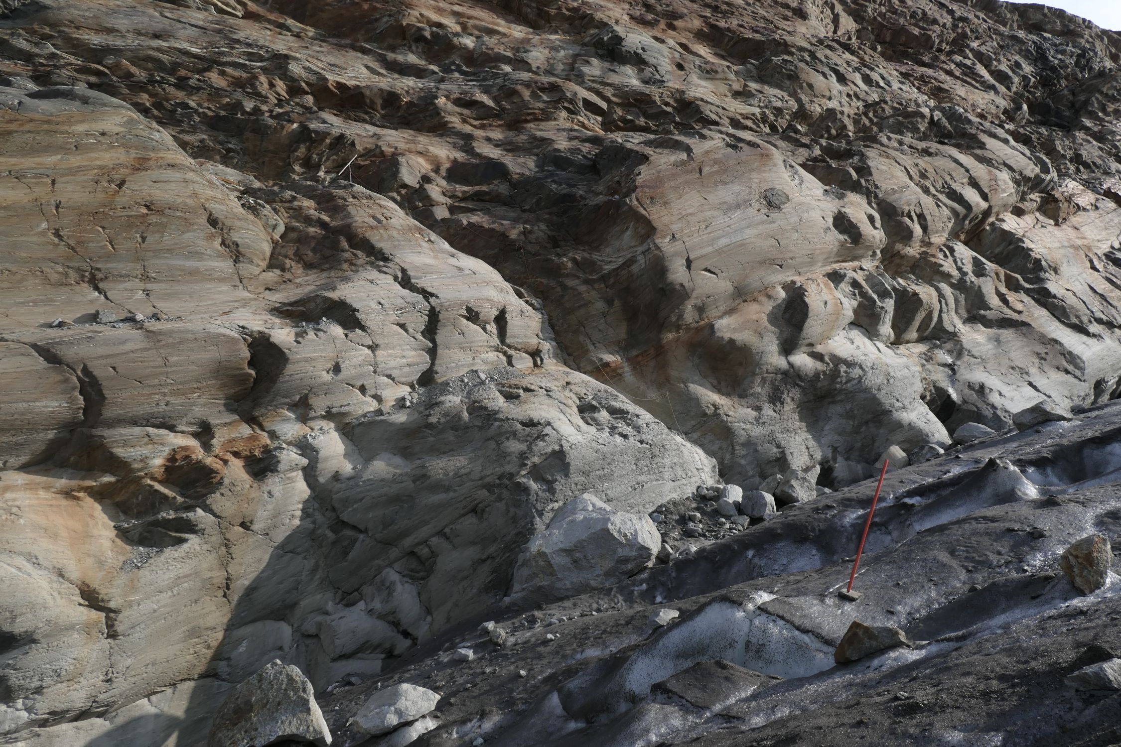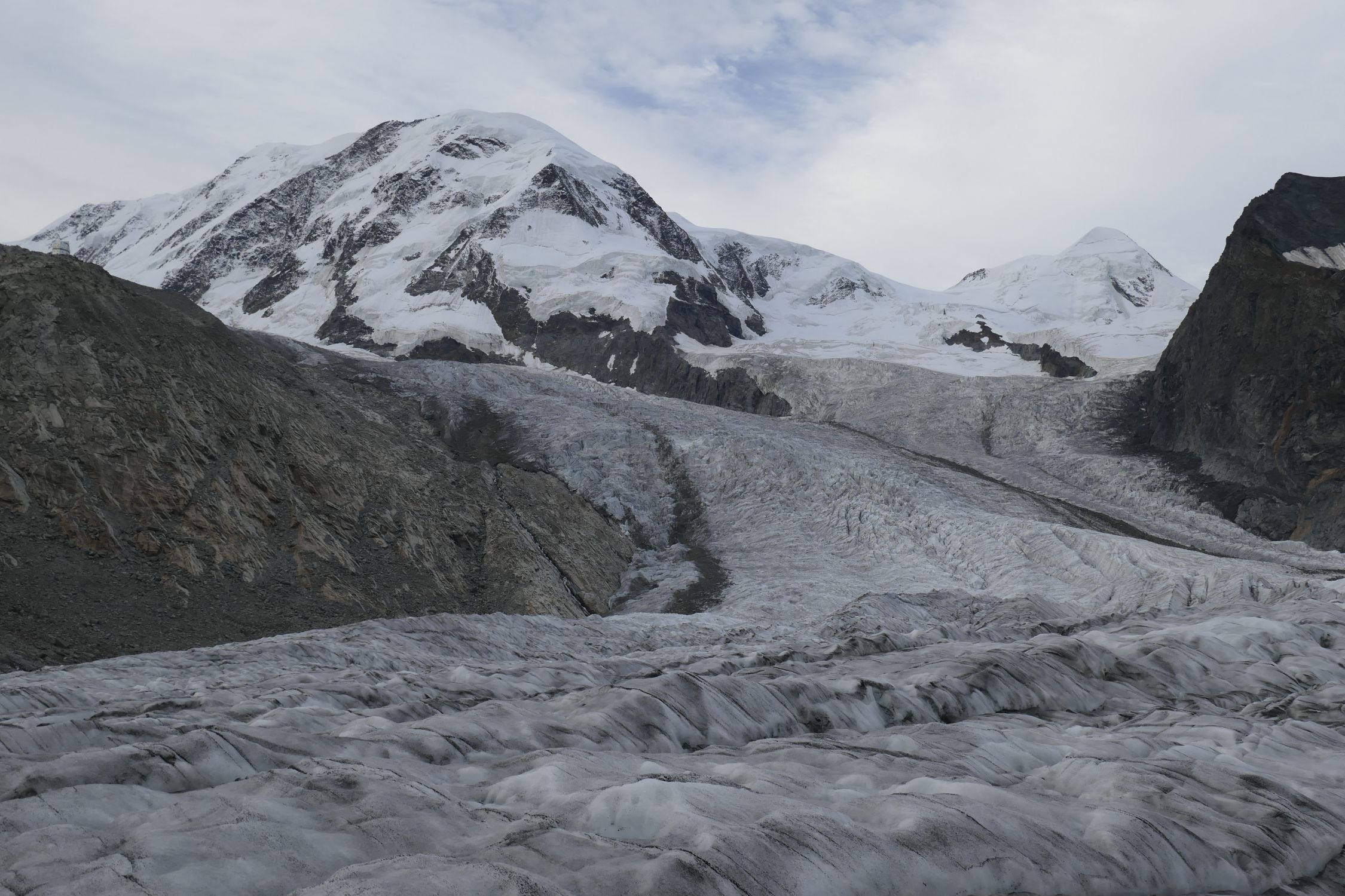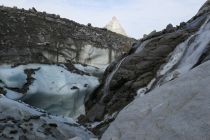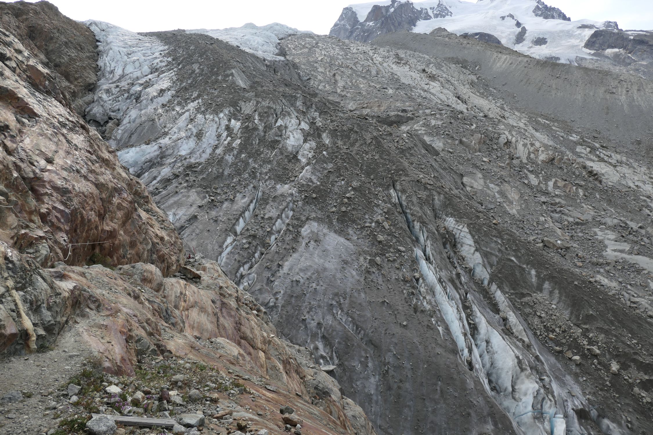 Danach steigt die perfekt markierte Route in östlicher Richtung zunächst über geneigte Felsplatten (mehrere Fixseile und Eisentritte) und dann in flachem Moränenschutt wieder an. Ganz kurz muss der Gornergletscher (oder das, was von ihm noch übrig bleibt) nochmals betreten werden (nur für ein paar Minuten). Auch wenn der Aufwand dafür gross ist: Steigeisen empfohlen.