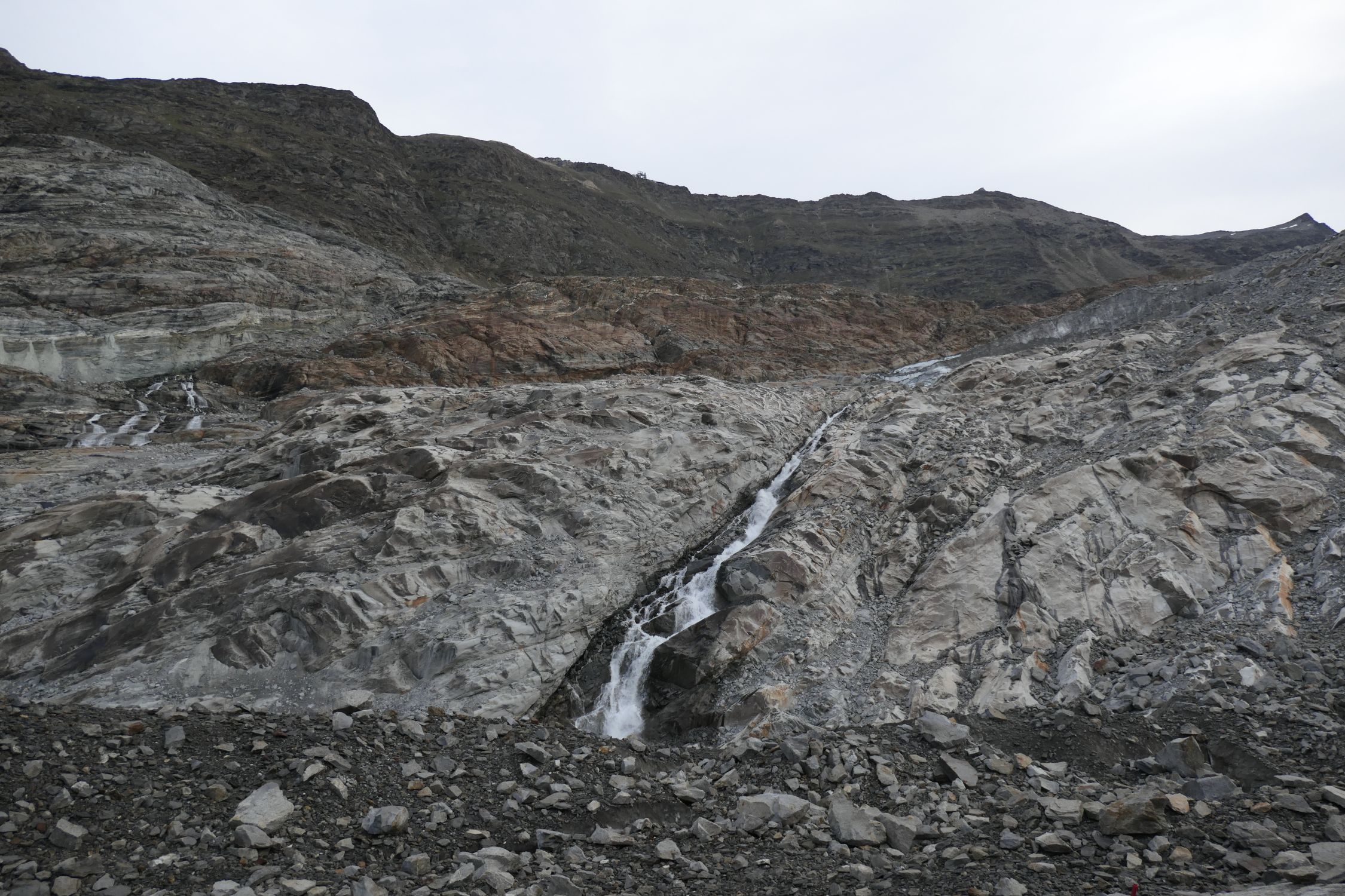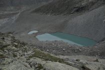 Gleich beim Haupteingang auf der Westseite der Hütte beginnen die blau-weissen Markierungen, die über Felsplatten und z.T. Moränenschutt zum Gornersee leiten. Nach ihm führt eine Brücke über den Bach, deren Existenz ich für einen blau-weiss markierten Weg eher etwas übertrieben halte. Weiterhin auf sehr gut sichtbarem und markiertem Weg runter zum Gletscherrand.