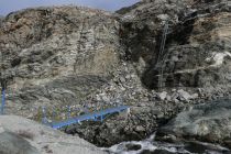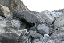 Achtung beim Aufenthalt am Fusse der Felswand (z.B. beim Anziehen der Steigeisen): Unachtsame Begeher des darüber liegenden Querganges könnten Steine lostreten, die hier unten zu gefährlichen Geschossen werden!