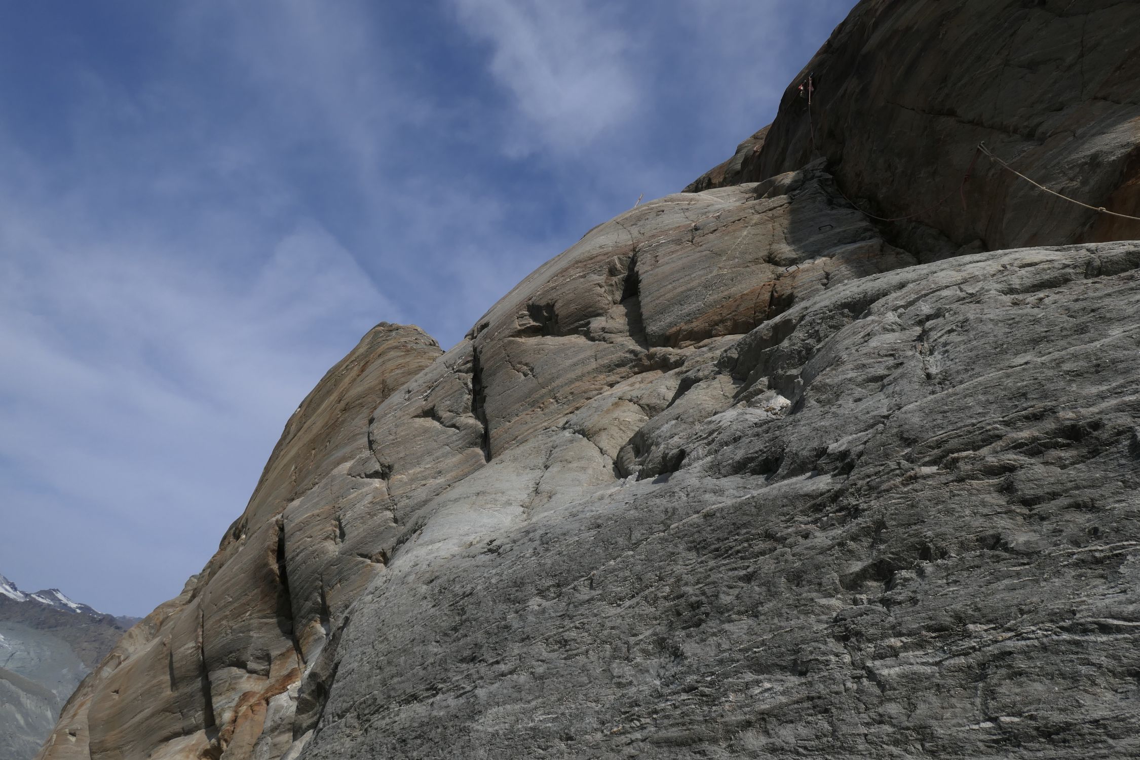 Die Markierungsstangen auf dem Gletscher leiten zu einer Felswand mit einer Reihe von Fixseilen. Beim 2. Seil empfand ich es als herausfordernd, dass das Fixseil ebenso wie die wirklich guten Griffe auf der gleichen Seite (im Aufstieg rechts) sind. Ein Fixseil auf der linken Seite und/oder 1 - 2 zusätzliche künstliche Tritte würde diese Stelle deutlich entschärfen. Hier haben selbst Hochtourengänger z.T. ihr Bergseil nochmals ausgepackt. Mit gutem Grund: Ein Sturz hier könnte fatale Folgen haben. Die Fixseile erlauben es, einen sehr gut begehbaren (und mit weiteren Fixseilen und z.T. sogar Geländerstangen versehenen) Quergang zu erreichen, der in westlicher Richtung aus der Felswand hinaus führt. Bitte auf dem Quergang peinlichst genau darauf achten, dass man keinen der zahlreichen Steine lostritt - sie würden das Leben von evtl. sich darunter aufhaltenden Berggängern gefährden.